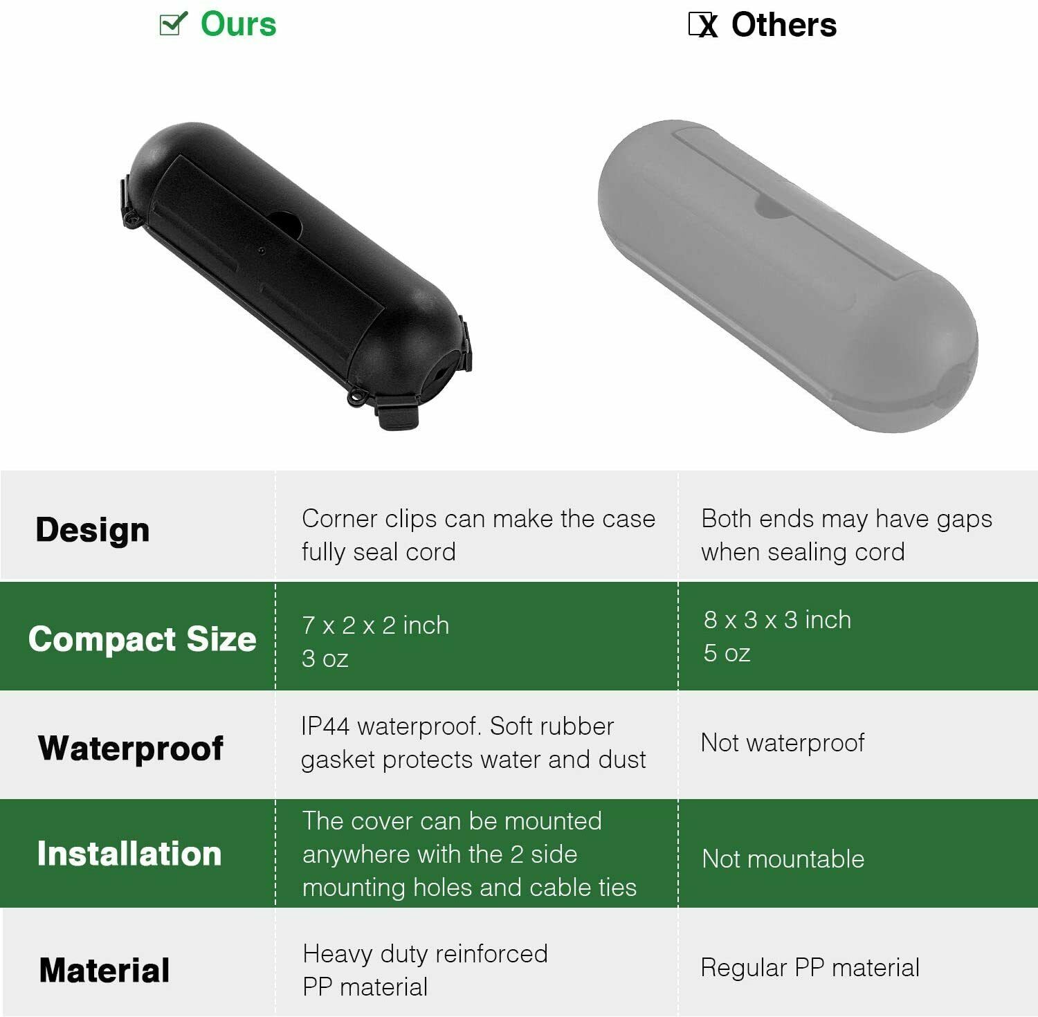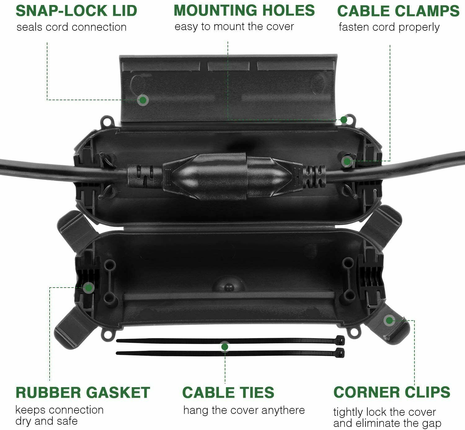 It features with small size and light weight, which are great to protect cord hanging in the air. The 2 mounting holes and included cable ties make it flexible to place anywhere.