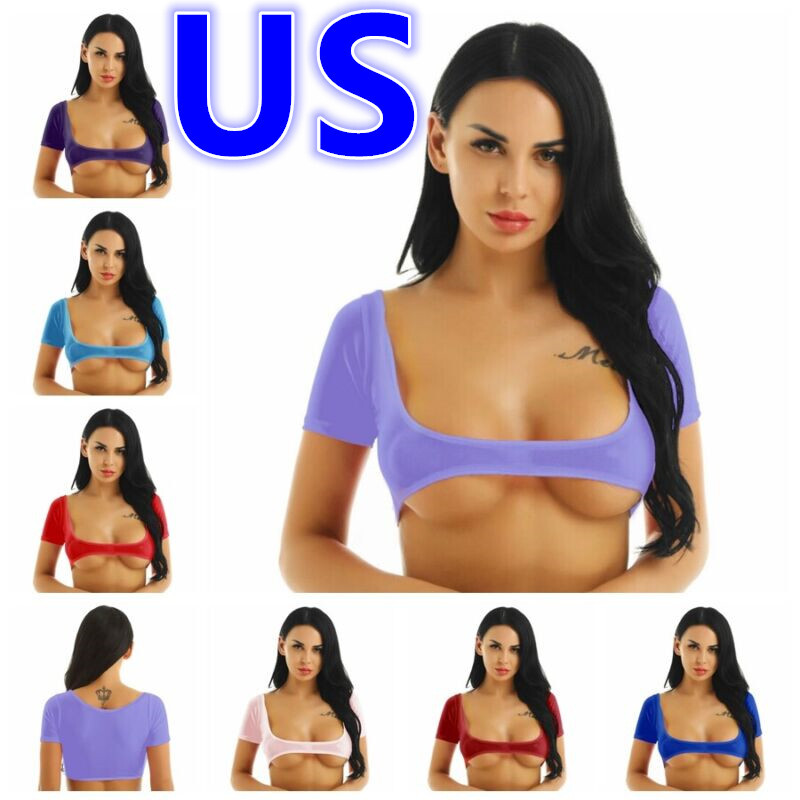 Womens Smooth Short Sleeve Crop Top Solid Color Round Neck Slim Fit T-shirt Swimwear.