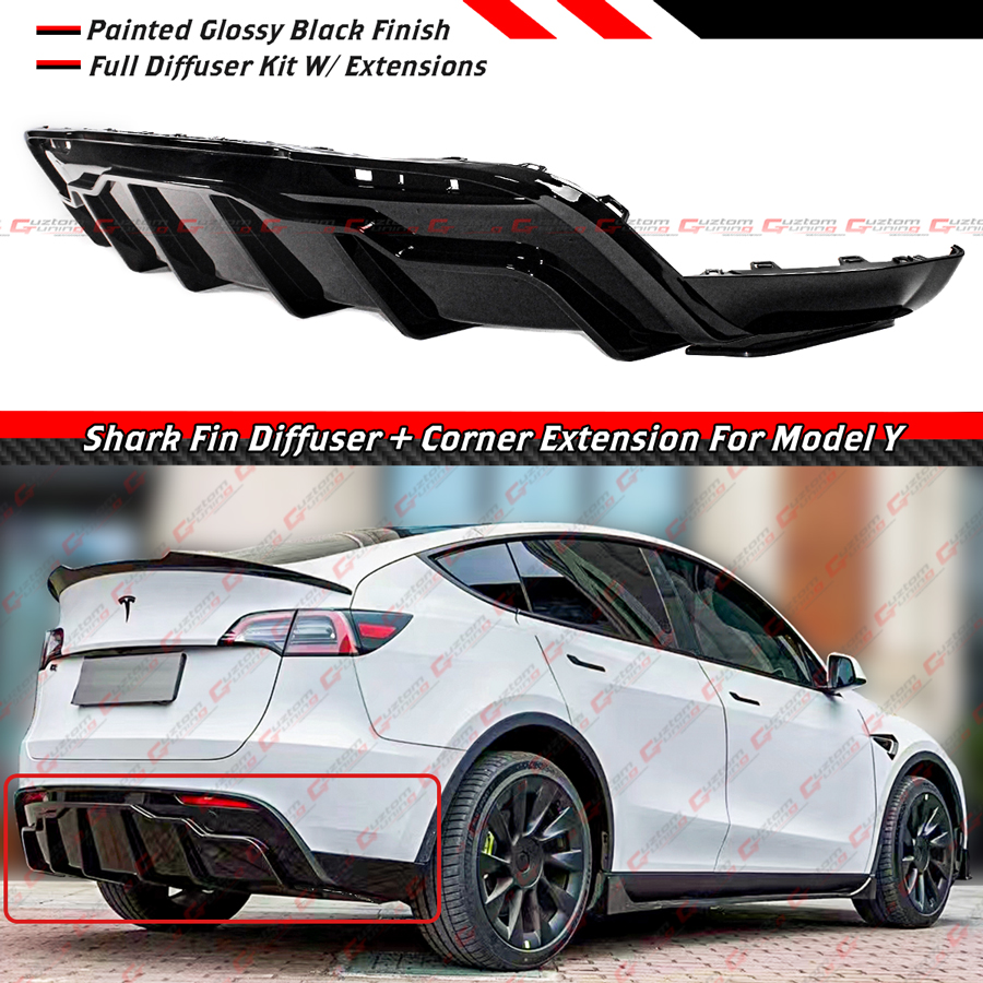 - Sporty Shark Fin Style Full Rear Diffuser Replacement Kit With Corner Extension At Decent Price. This is a Complete Diffuser Replacement Kit.