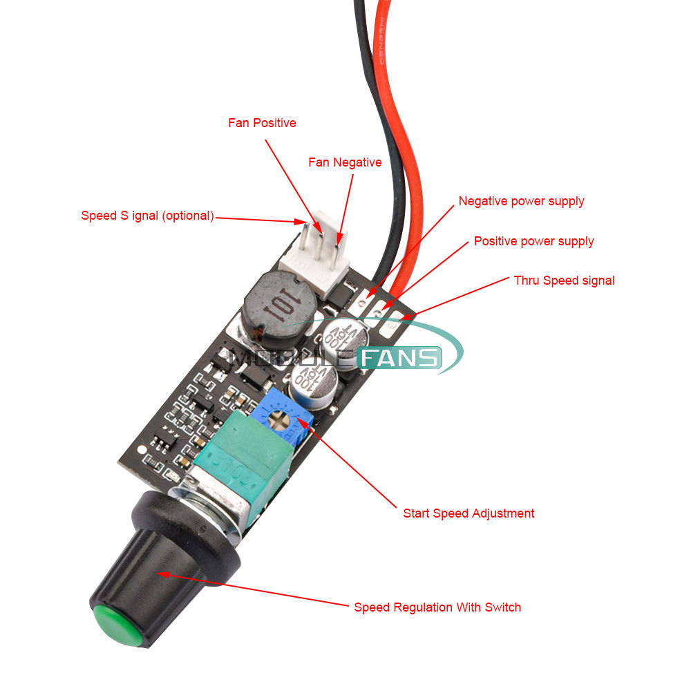 A separate small adjustable resistor (initial speed adjustment) on the board is used to adjust the speed at the just-open position. The input of the speed signal port is directly connected to the output of the fan. It is mainly used to guide the fan speed signal back to the main board of the device to detect the speed. No connection between controller circuits