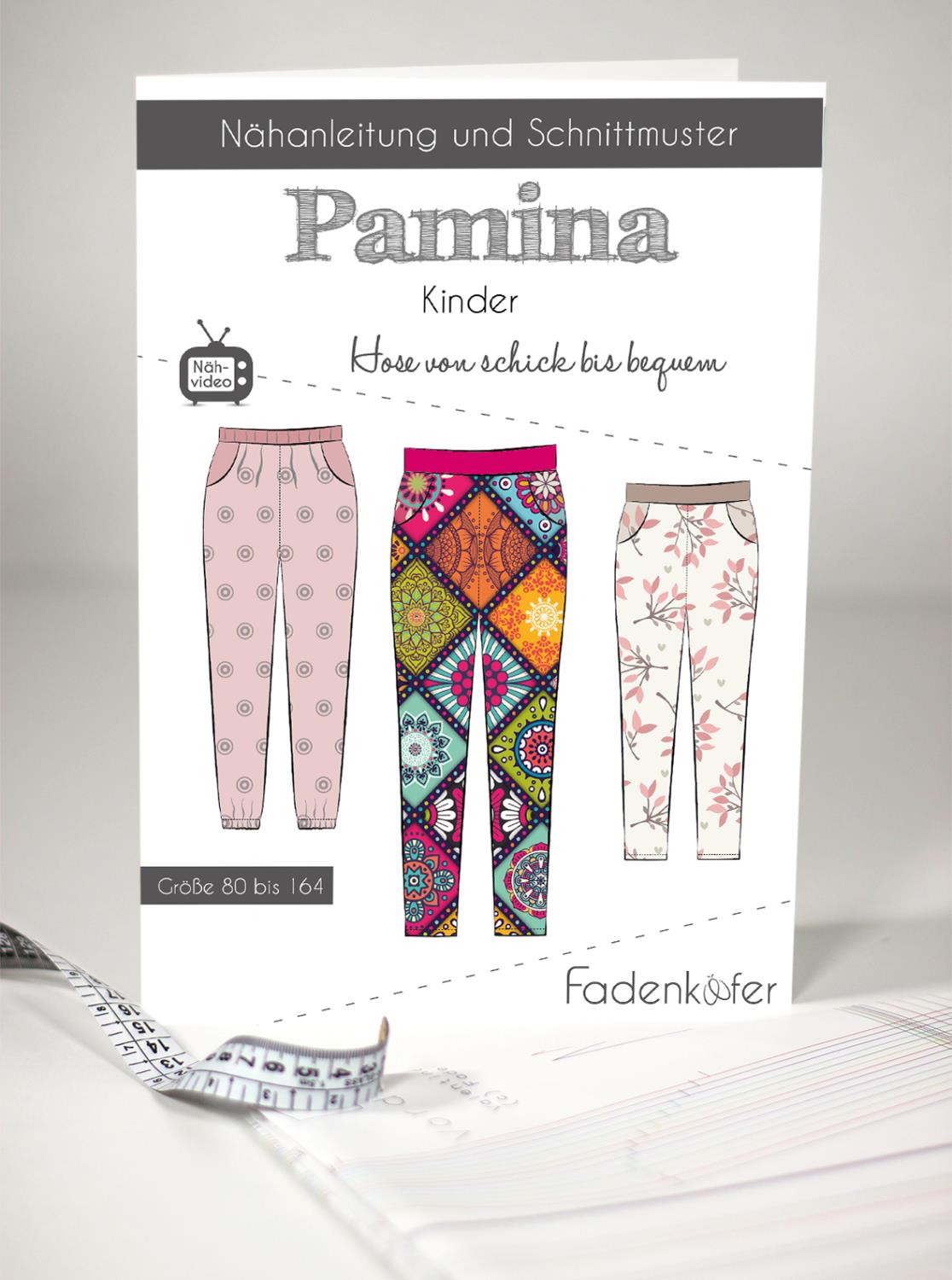 Pamina von schick bis bequem !Die Hose Pamina kann aus verschiedenen Stoffen genäht werden. Besonders gut eignen sich Viskose, Seide oder dünner Stretchjersey,leicht fließende Webware, Viskose oder Voile.Die Eingriffstaschen können nach Bedarf weggelassen werden. Ein Basicschnitt, der euer Kreativität keine Grenzen setzt. Schnell und einfach genäht und mit einer Anleitung im Gepäck, sollten auch Anfänger keine Probleme haben.Mit den Größen 80-164 sind viele Größen abgedeckt.Dieses Set enthält :alle Schnittmusterteile in Farbe auf einem Großdruckformatpapierschnittmuster - Bogen gefaltet als DIN-A4 verpackt im Druckverschluss - Beutel gedruckte Kurzanleitung Schritt für Schritt - Bildanleitung zum Download