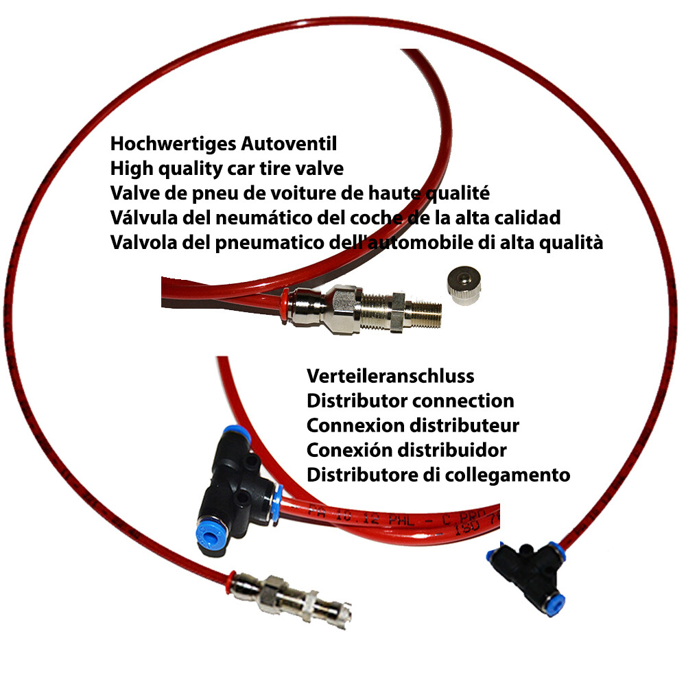 Con la válvula del coche en el otro lado, los amortiguadores neumáticos se pueden llenar con aproximadamente 6 bares en cualquier gasolinera para camiones.