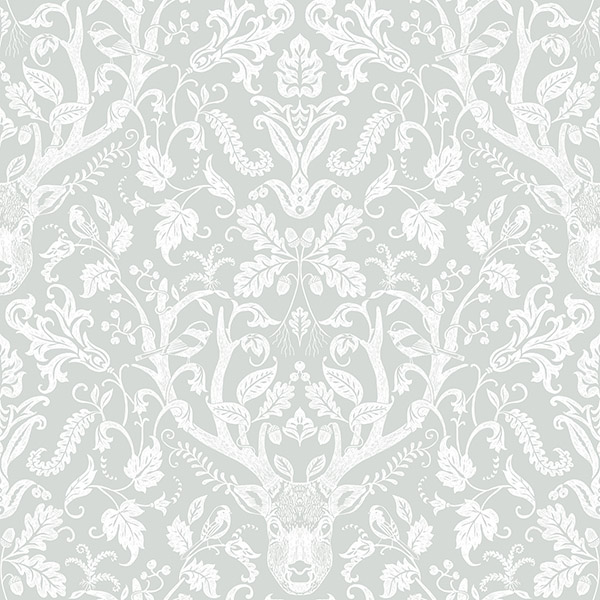 Whimsical meets lodge with this enchanting light grey and white wallpaper. Featuring lively forest flora and stags with impressive antlers, this damask print has a hand drawn design and dreamy style. Kiwassa is a prepasted, easy walls wallpaper.