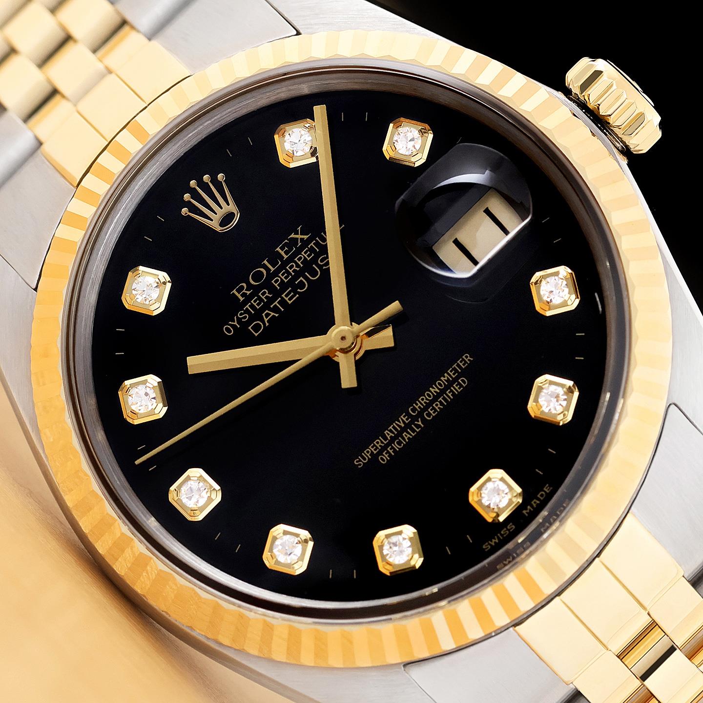ROLEX MENS DATEJUST 16013 BLACK DIAMOND DIAL 18K YELLOW GOLD STEEL 2-TONE WATCH