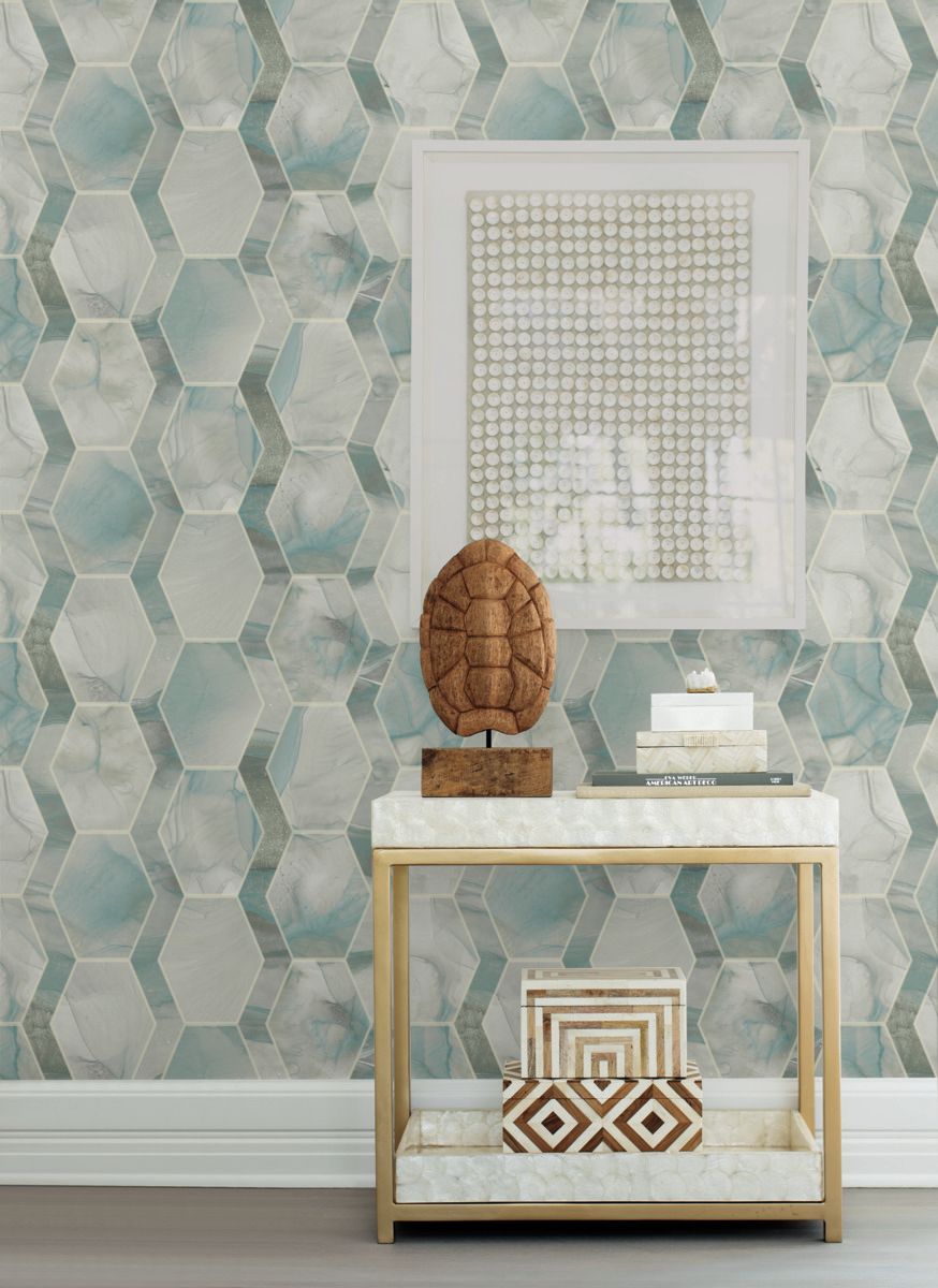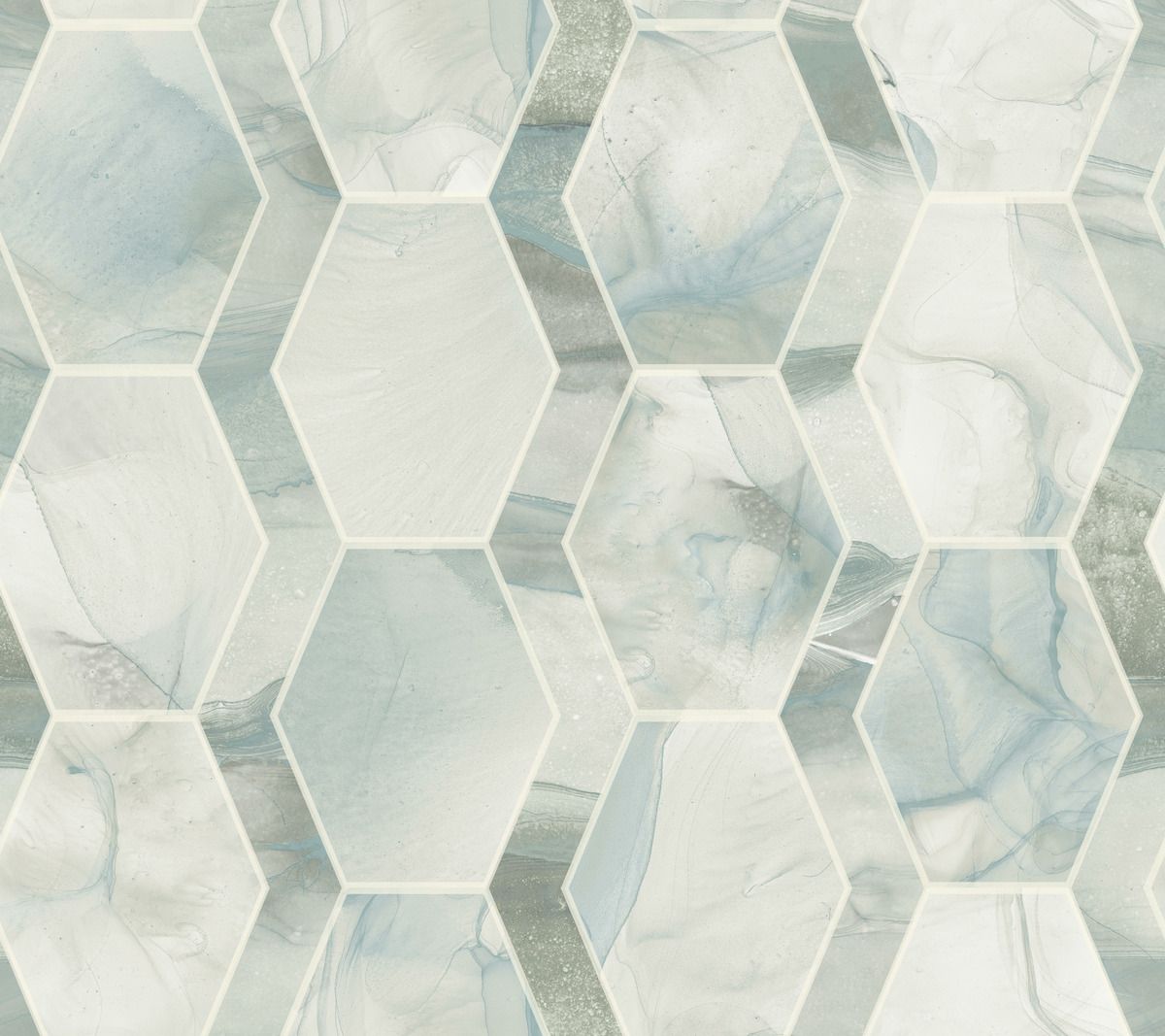 Minerals and marble create a distinctive, natural hexagon tile in pattern Earthbound.