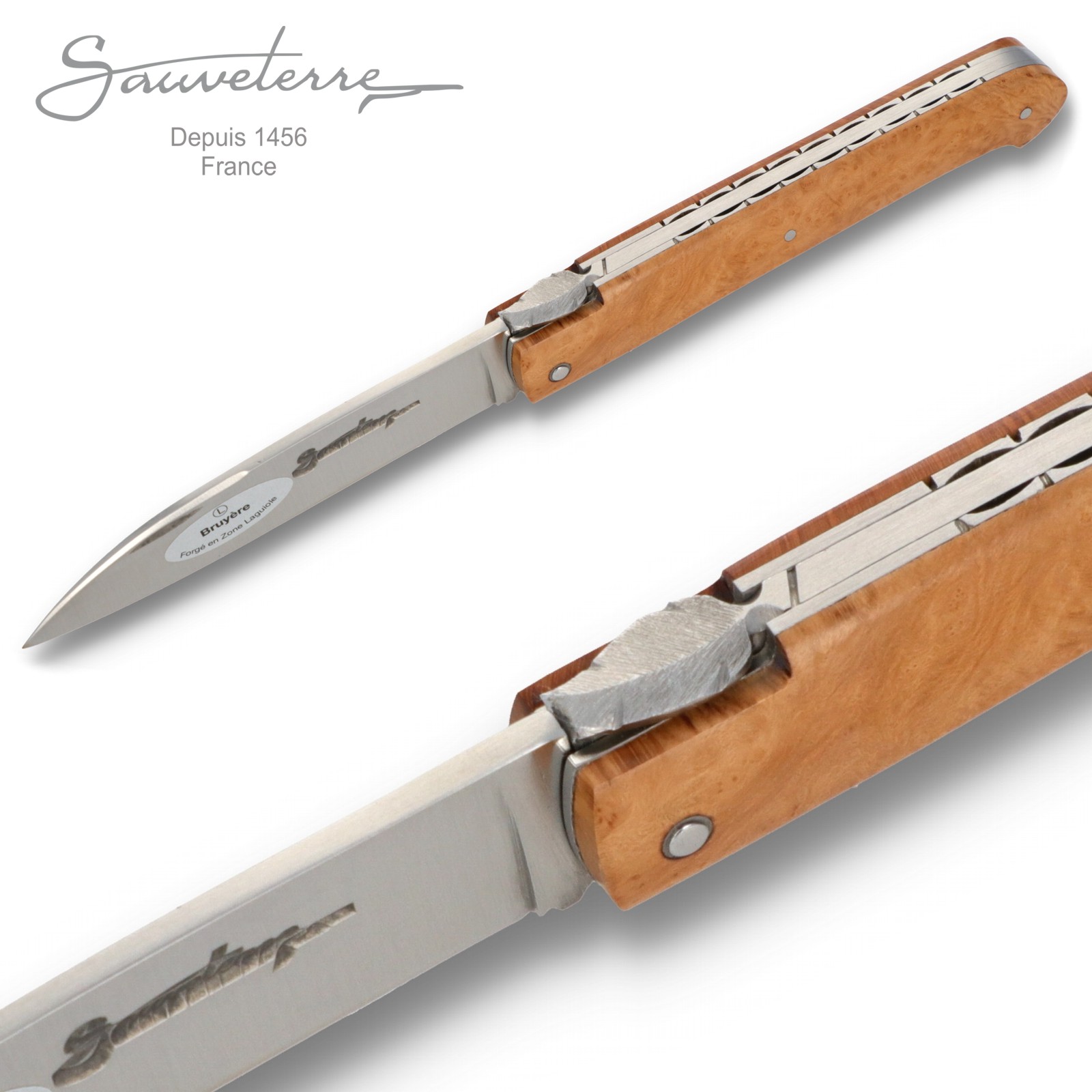 Die Sauveterremesser tragen am Kopf der Feder ein Salbeiblatt, das auch im Stadtwappen zu finden ist. Bei diesem besonderen Modell sind die Platinen und das Salbeiblatt fein verziert.