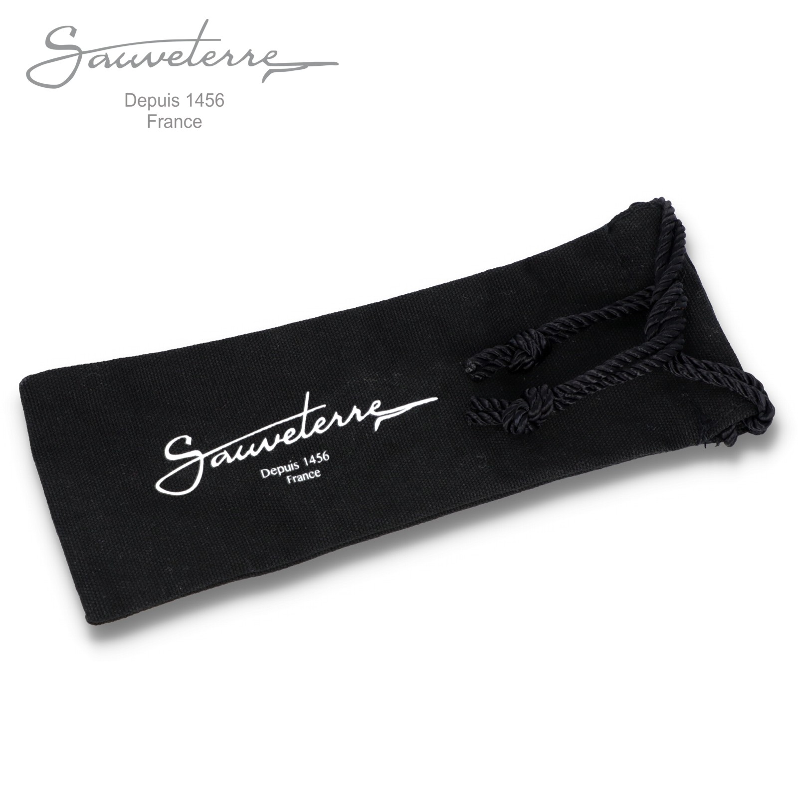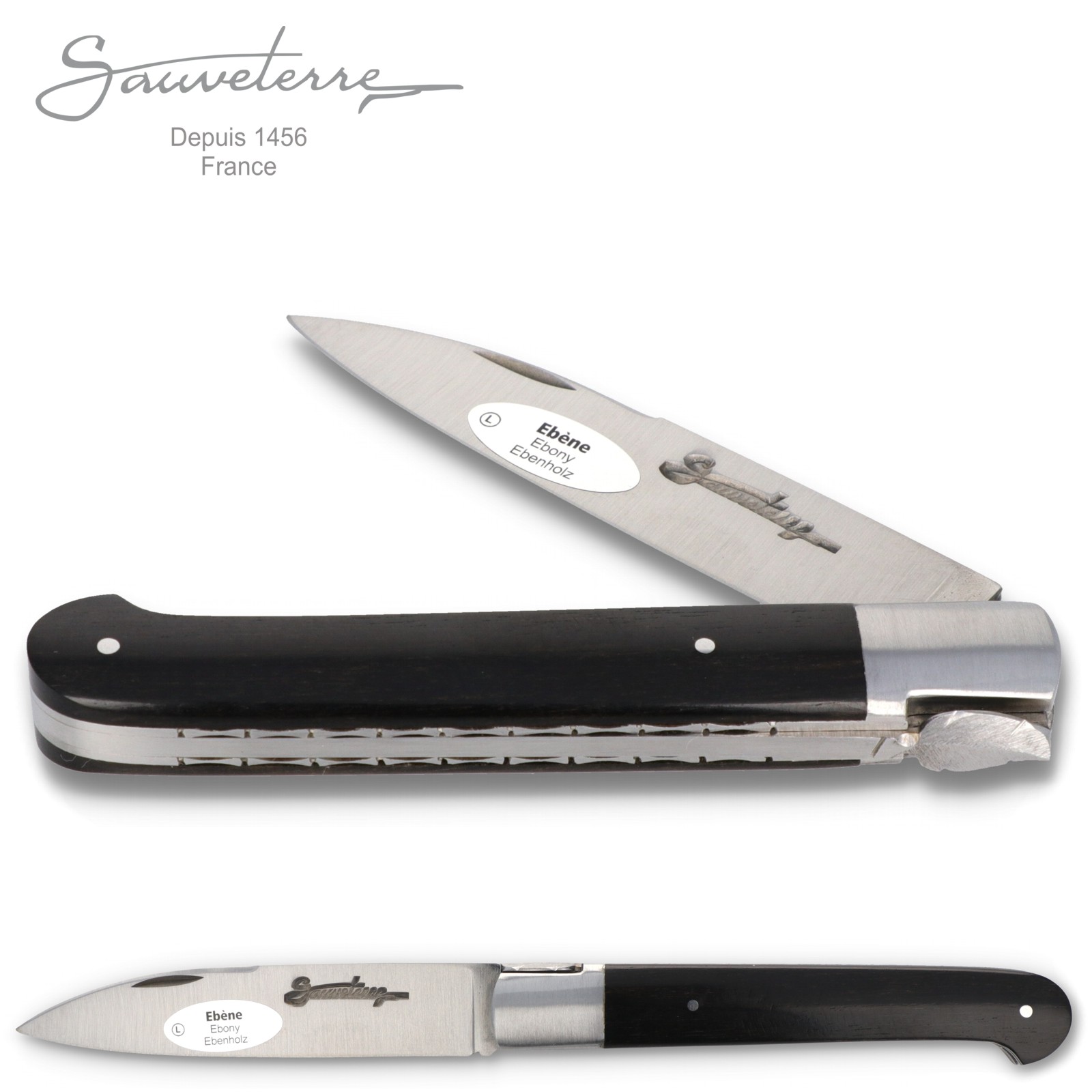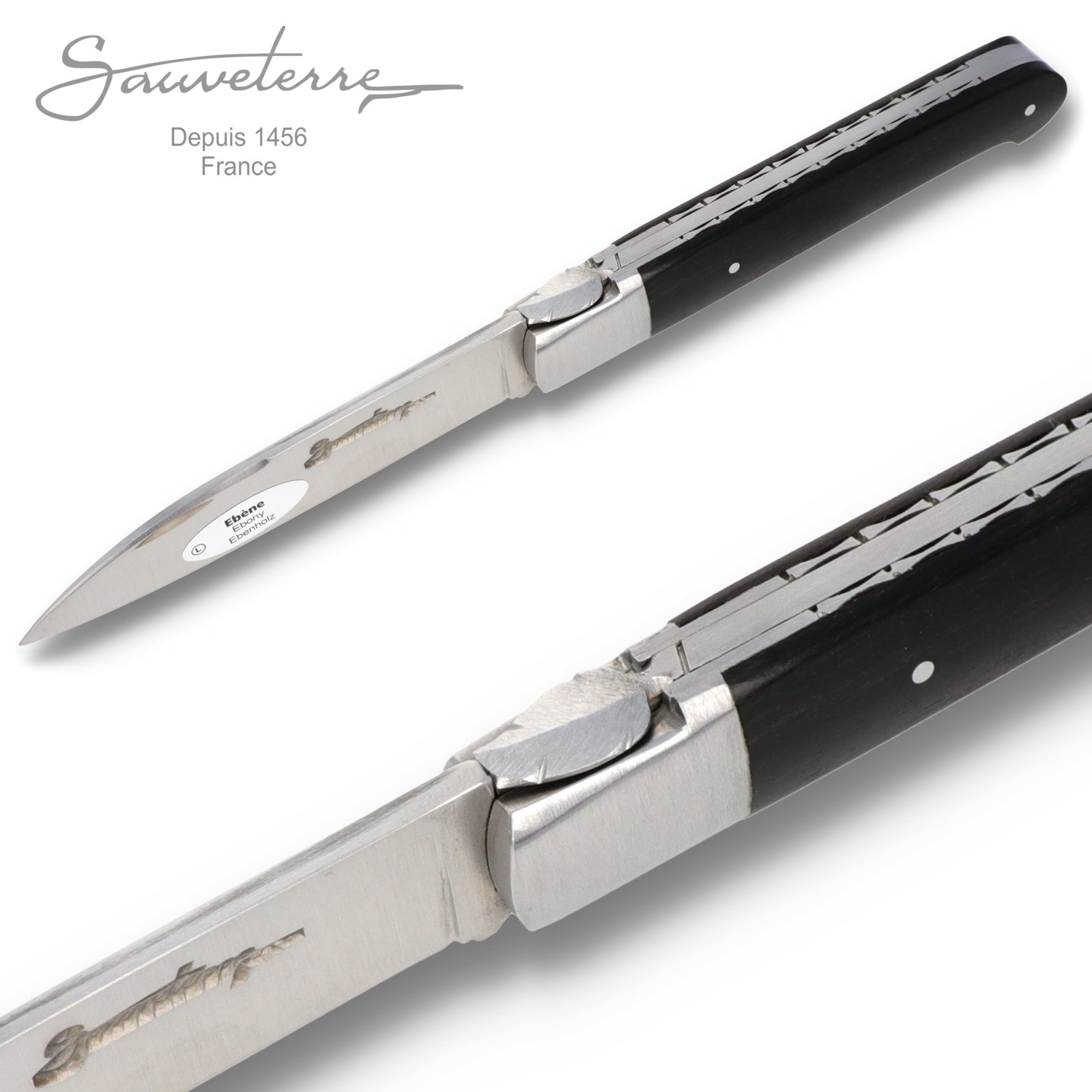 Die Sauveterremesser tragen am Kopf der Feder ein Salbeiblatt, das auch im Stadtwappen zu finden ist. Bei diesem besonderen Modell sind die Platinen und das Salbeiblatt fein verziert.