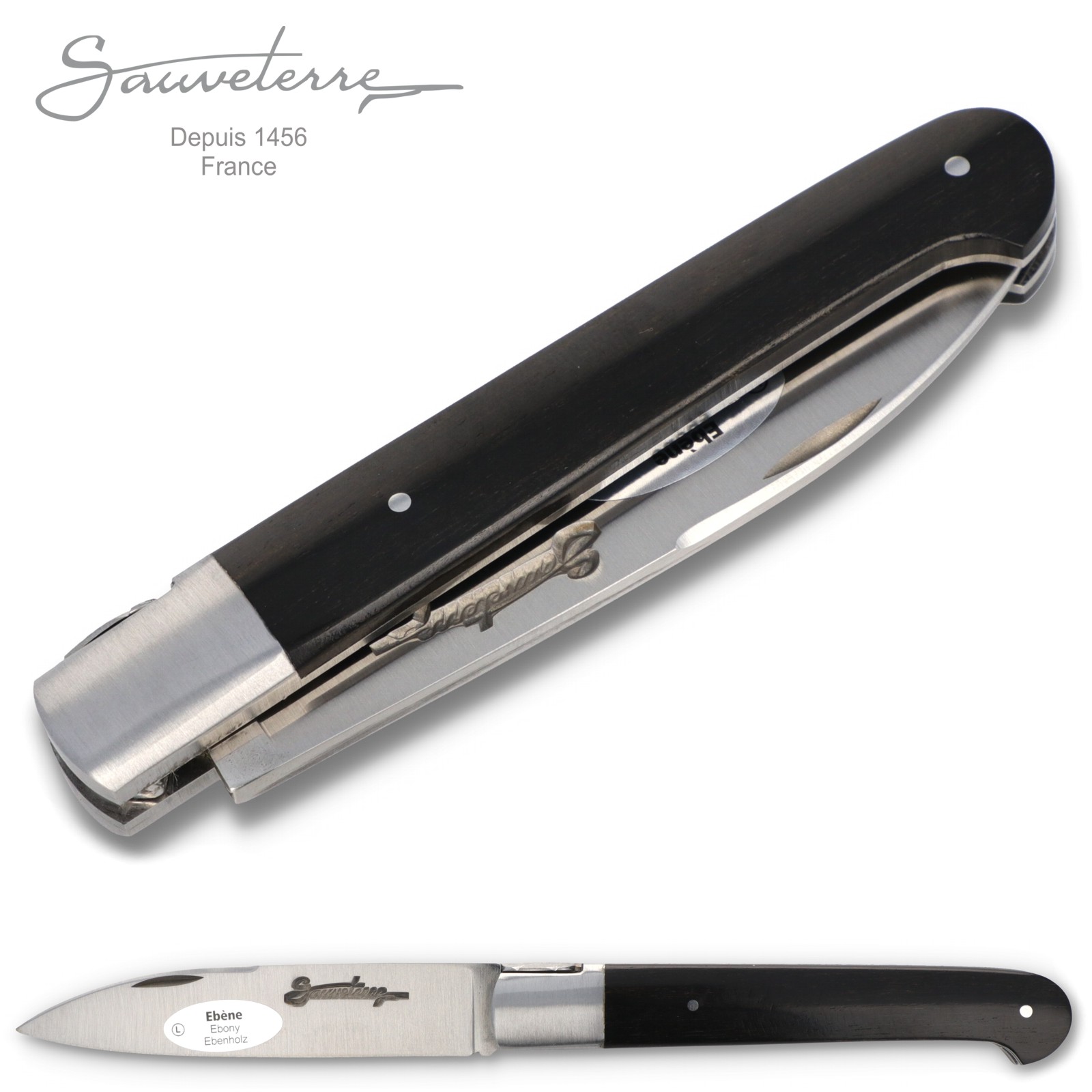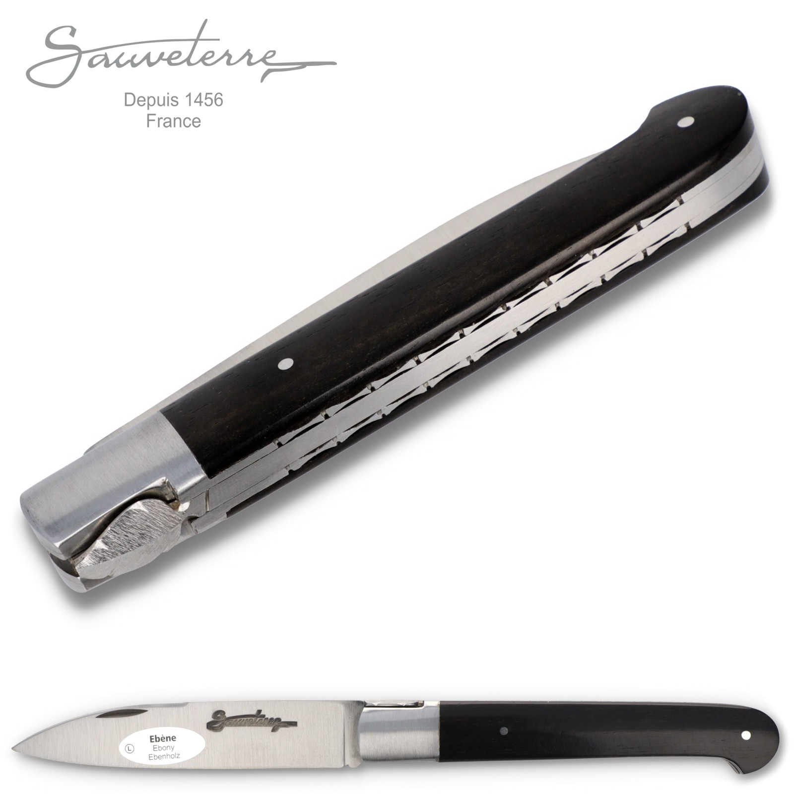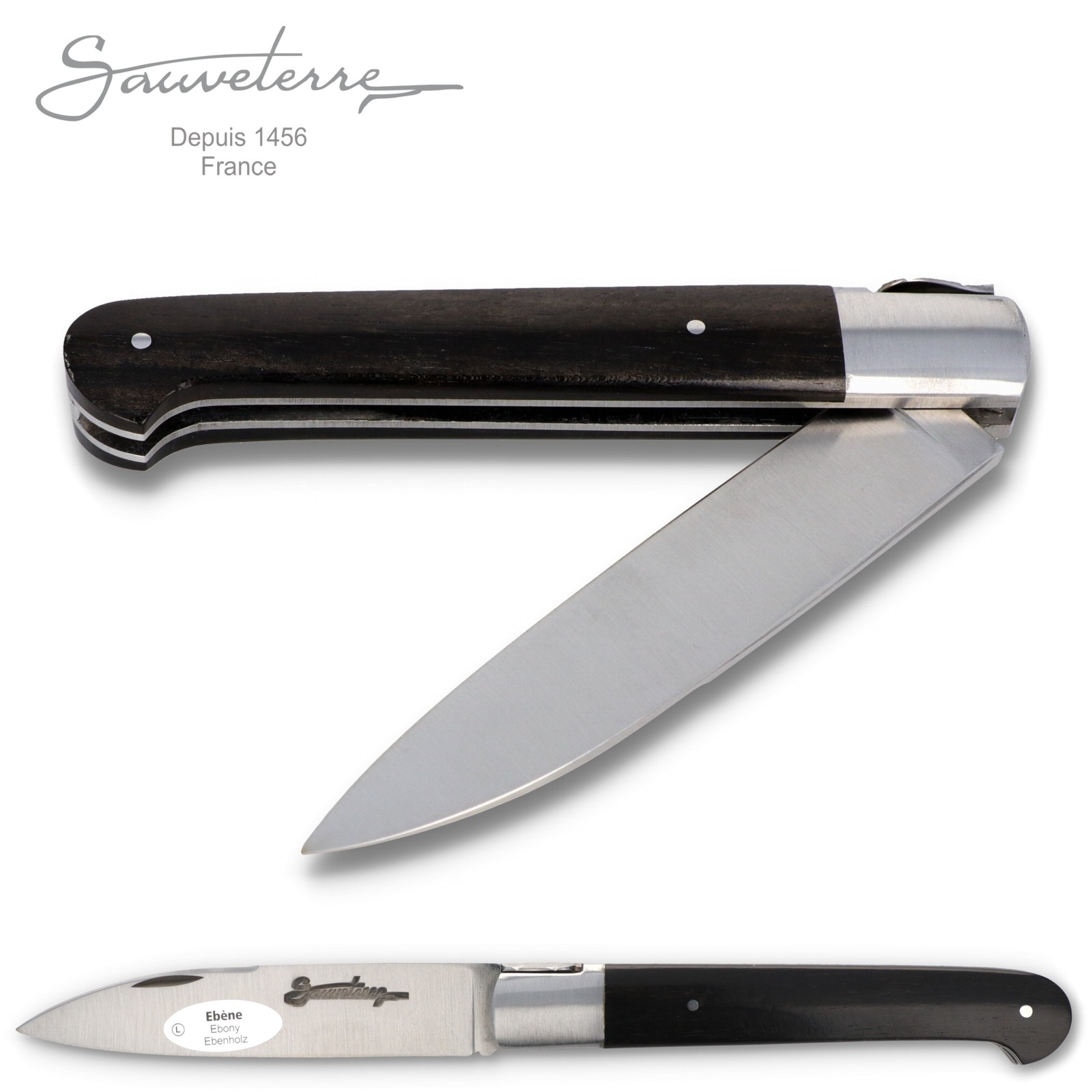 Die Griffschalen dieses Modells bestehen aus schwarzem Ebenholz. Zur Klinge hin ist der 11 cm lange Griff von massiven, satinierten Edelstahlbacken eingefasst.