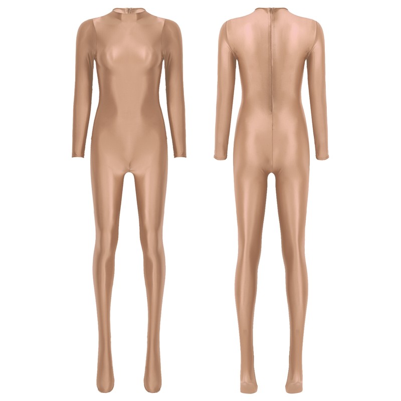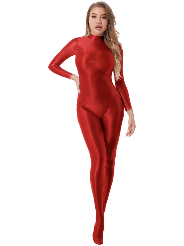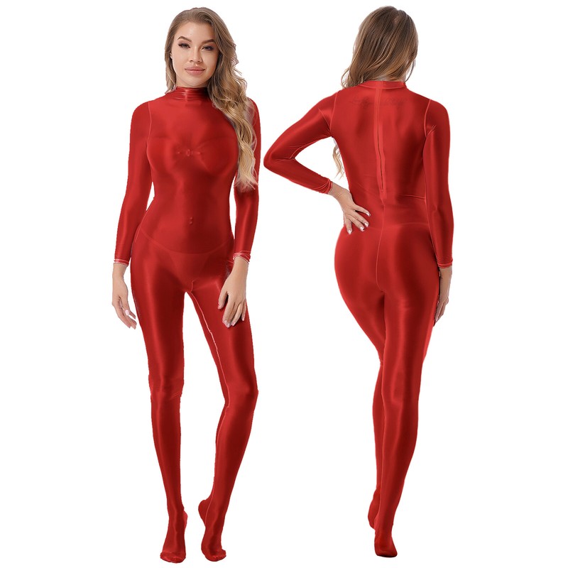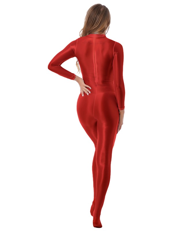 Womens Mock Neck Back Zipper Bodystocking Glossy Solid Color Long Sleeve Bodysuit.