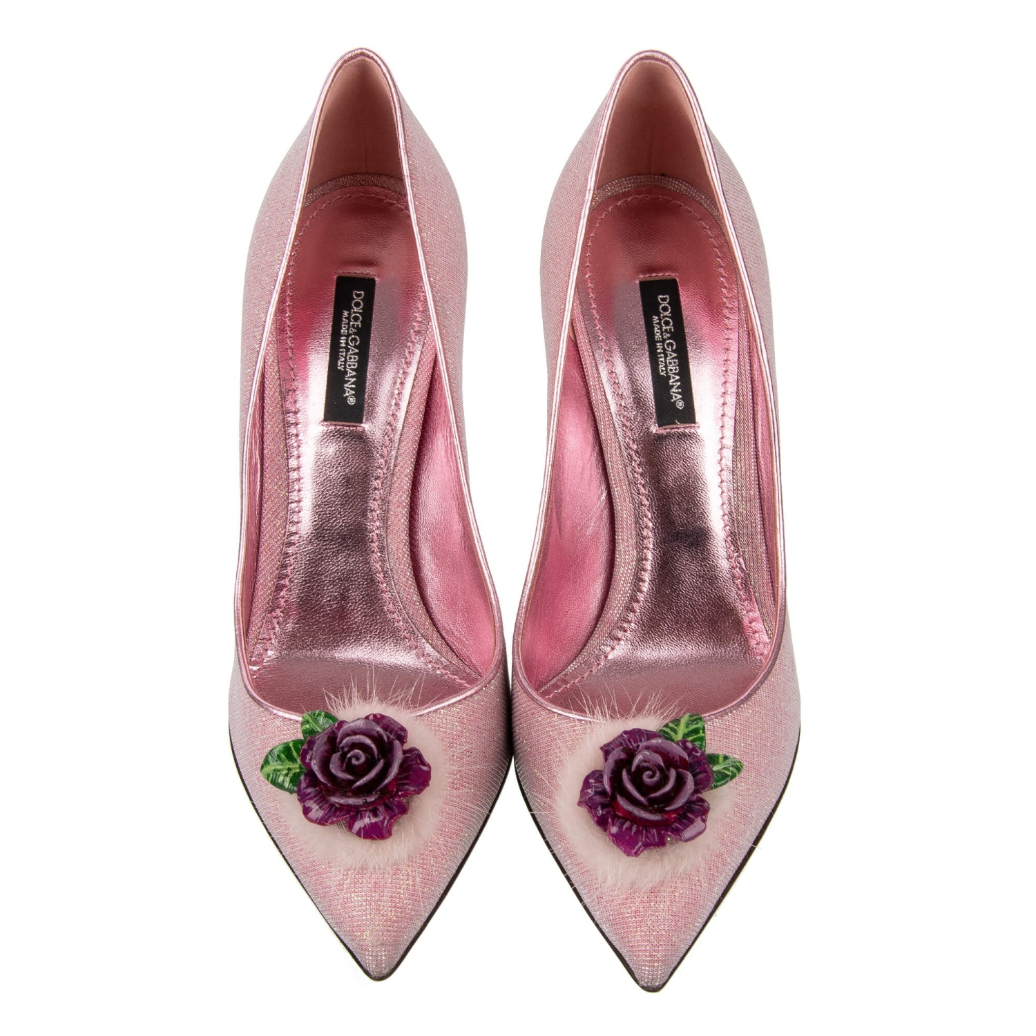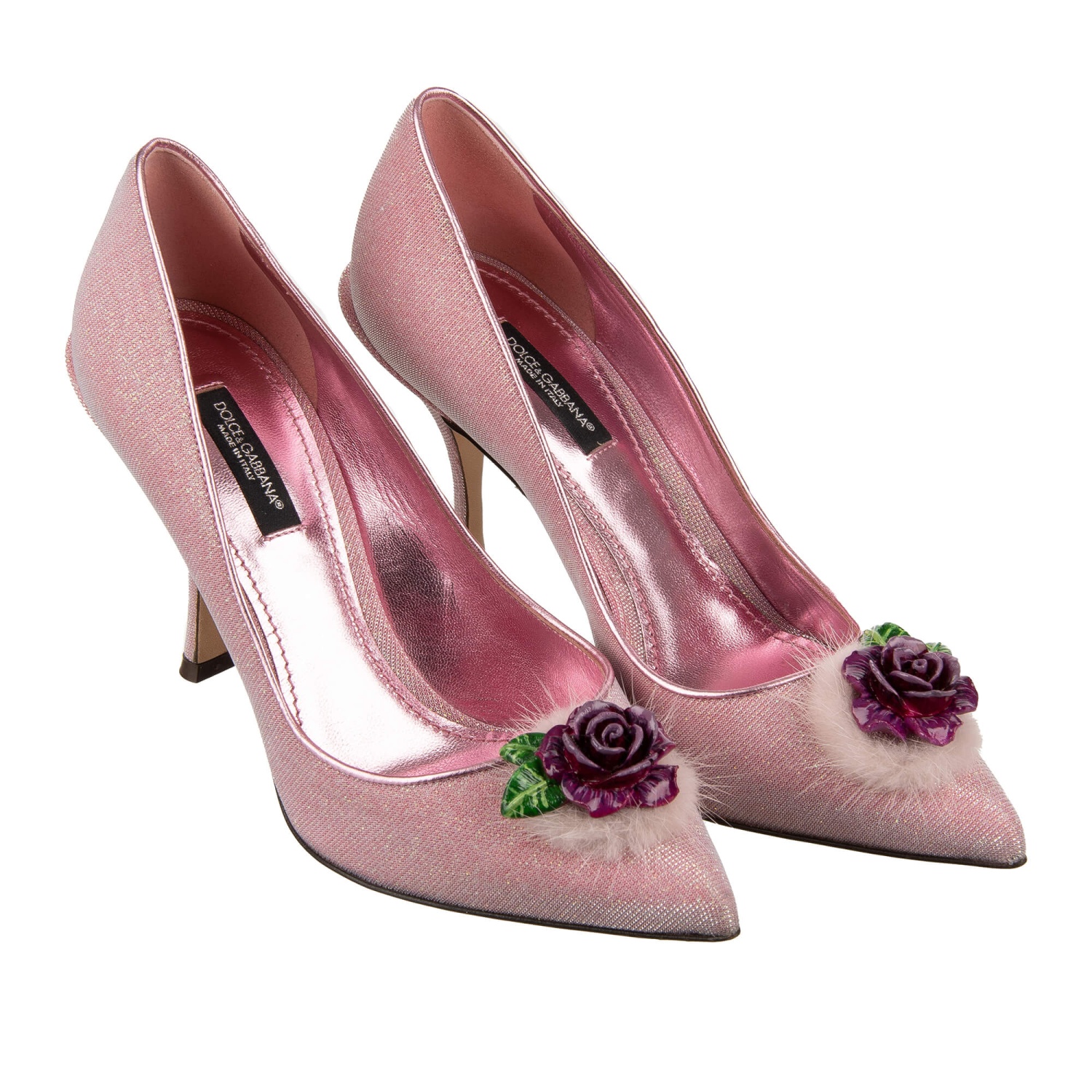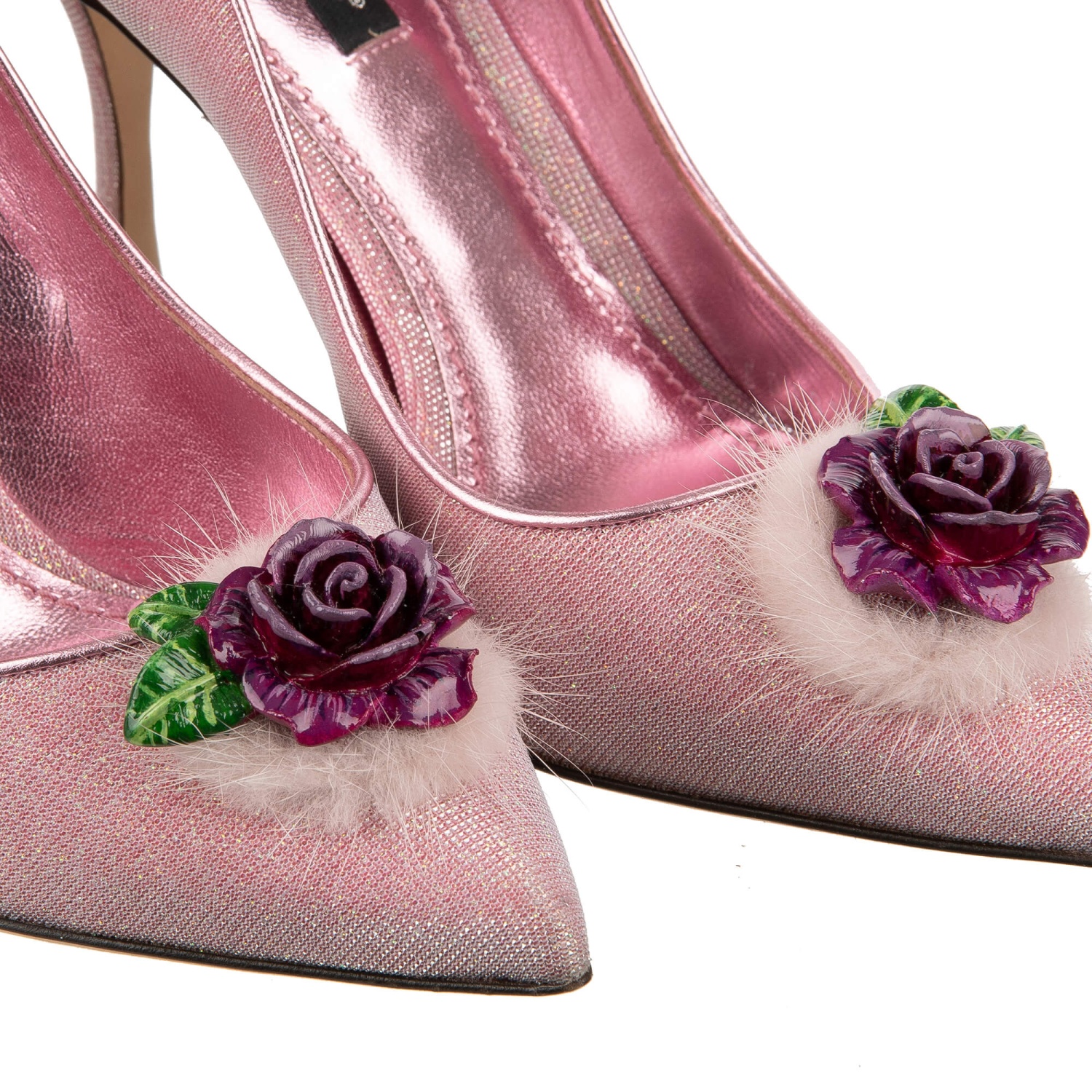 - Pointed Lurex and Leather Pumps LORI with hand-painted rose brooch in pink by DOLCE & GABBANA