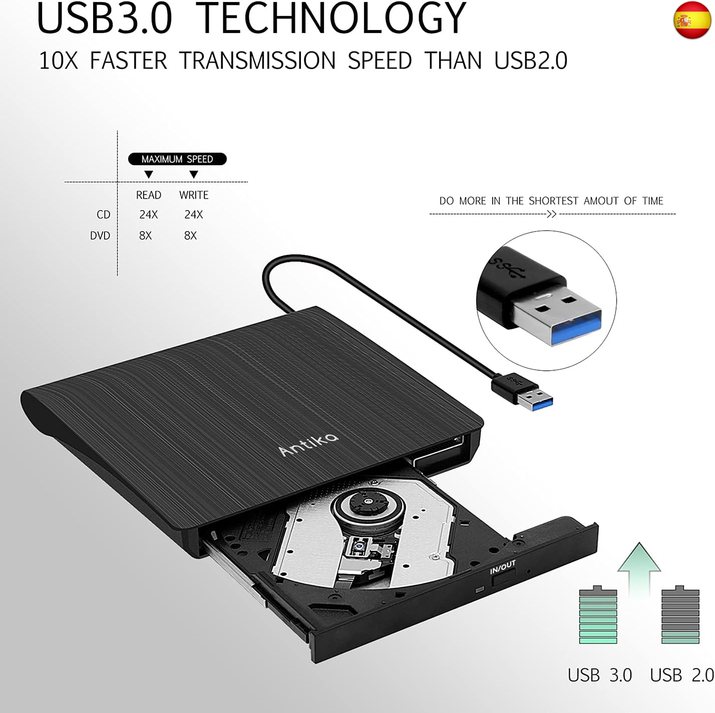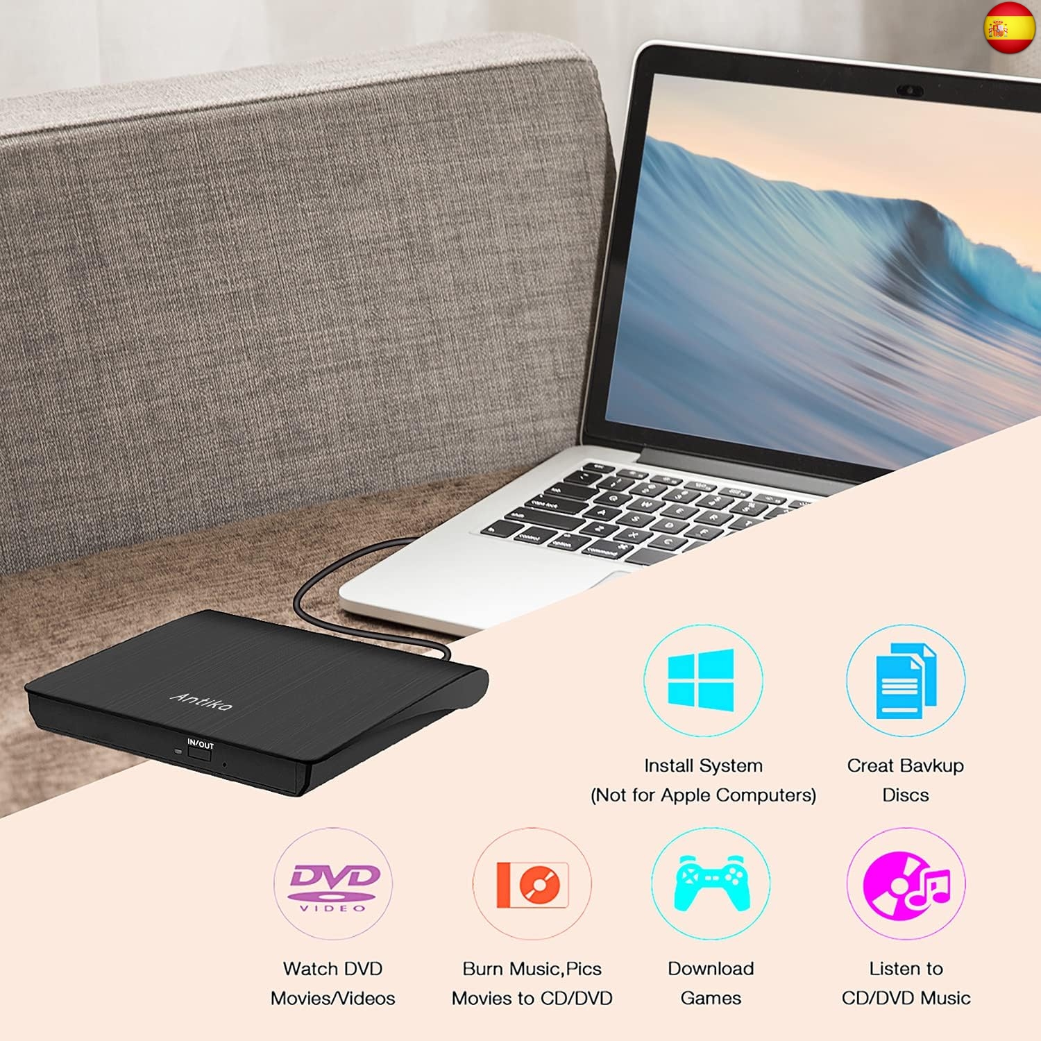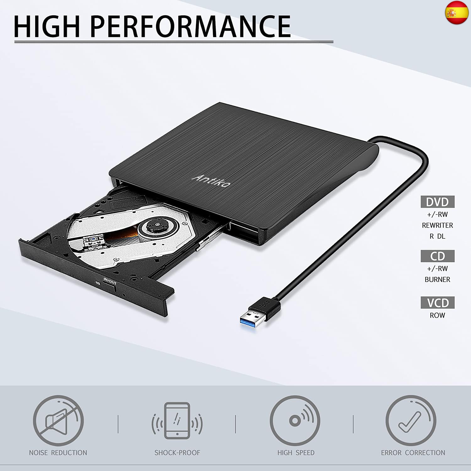 Fácil de usar Plug and Play. La unidad de DVD externa Cocopa se alimenta del puerto USB. No necesita controlador ni alimentación externa. Simplemente conéctelo a su puerto USB y se detectará el controlador de DVD. El controlador de DVD USB 3.0 es un compañero perfecto para computadoras sin la unidad interna. Puede grabar archivos, instalar software y crear un CD de respaldo. Esta grabadora de CD DVD RW le permite ver películas