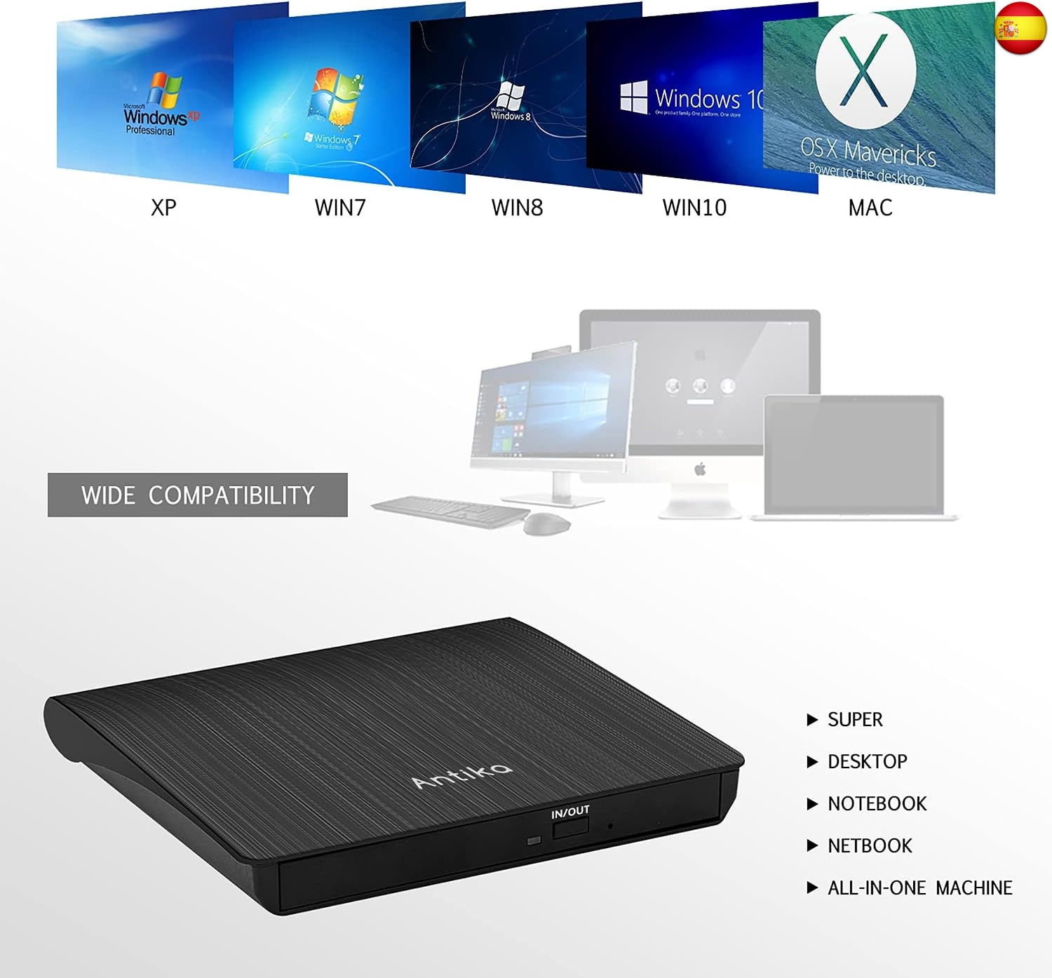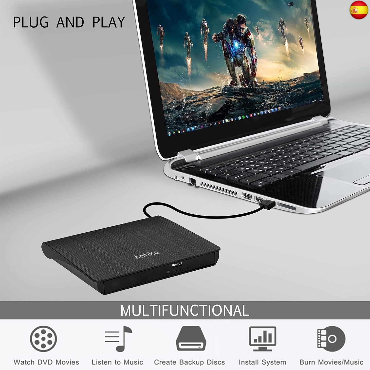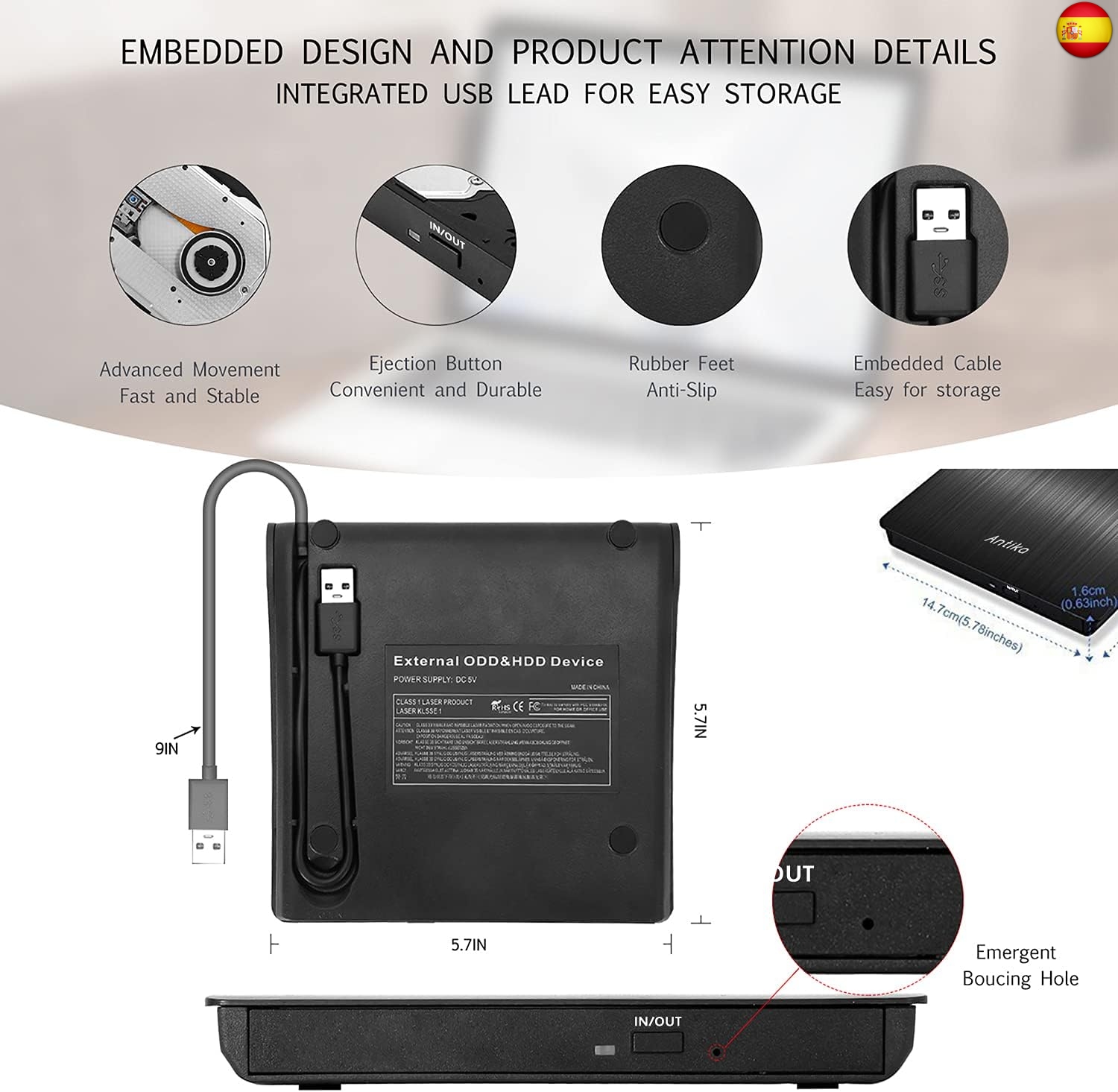 Fácil de usar Plug and Play. La unidad de DVD externa Cocopa se alimenta del puerto USB. No necesita controlador ni alimentación externa. Simplemente conéctelo a su puerto USB y se detectará el controlador de DVD. El controlador de DVD USB 3.0 es un compañero perfecto para computadoras sin la unidad interna. Puede grabar archivos, instalar software y crear un CD de respaldo. Esta grabadora de CD DVD RW le permite ver películas