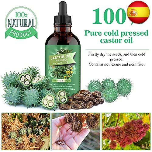 Aceite de Ricino Prensado en Frío 100% Natural * Aceite de Ricino 100% Puro: nuestro aceite de ricino está hecho de semillas de ricino de alta calidad que se prensan en frío y se extraen. Es aceite de ricino puro 100% natural y no contiene productos químicos nocivos. * Fácil de Almacenar: el aceite de ricino se almacena en vidrio marrón hermético a la luz, lo que dificulta su descomposición durante el transporte y el uso ligero, asegura la efectividad del aceite de ricino y prolonga su vida útil. * Crecimiento y Cuidado del Cabello: nuestro aceite de ricino puede acelerar el crecimiento de las cejas, las pestañas y la barba y hacerlas más gruesas y largas. Utilice nuestro aceite de ricino para reparar profundamente su cabello. Repara el cabello quebradizo desde el interior. * Cuidado de la Piel y las Uñas: también es un humectante natural para la piel que puede reducir la pérdida de humedad de la piel. También puede reparar las uñas de las manos y los pies. Más conveniente, higiénico y portátil El paquete contiene 2 botellas de cosméticos vacías de 8 ml con cepillo para pestañas, cepillo para cejas y 1 embudo. Puede verter el aceite de ricino de una botella grande en la botella vacía provista para evitar que el aceite de ricino se contamine. Con la botella pequeña, puede llevar su aceite de ricino a donde quiera que vaya. Lista: 1 * 118 ml de aceite de ricino 1 * botellas vacías con cepillos de pestañas 1 * botellas vacías con cepillos para cejas 1 * embudo de llenado 1 * manual
