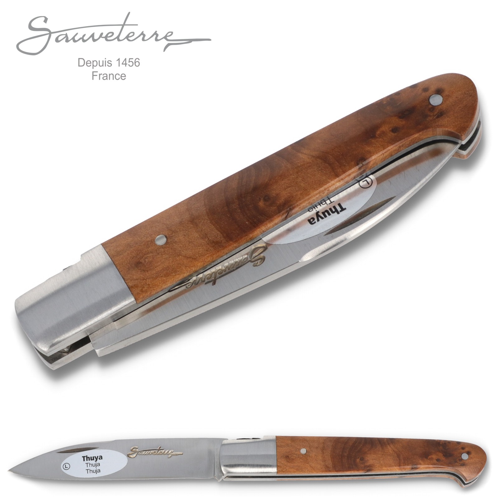 Die Griffschalen dieses Modells bestehen aus schönem Thuja Maserholz.