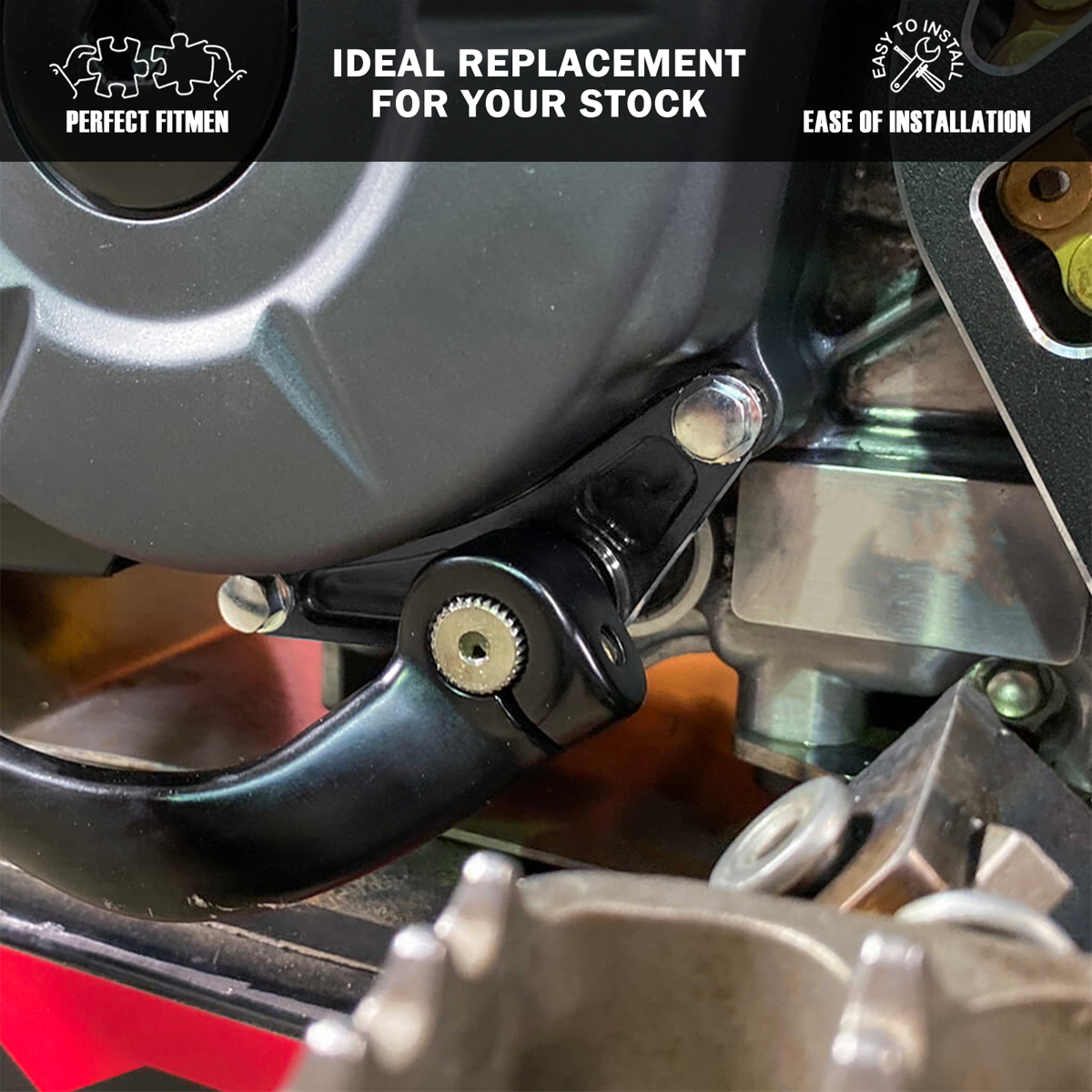 【Fast & Simple installation】Remove the shifter and the two bolts from the bottom of the ignition cover. Slip this over the end of the shift shaft and reinstall the 2 bolts to hold this in place