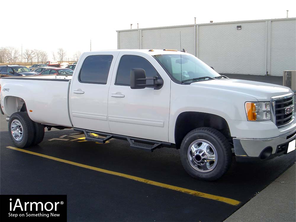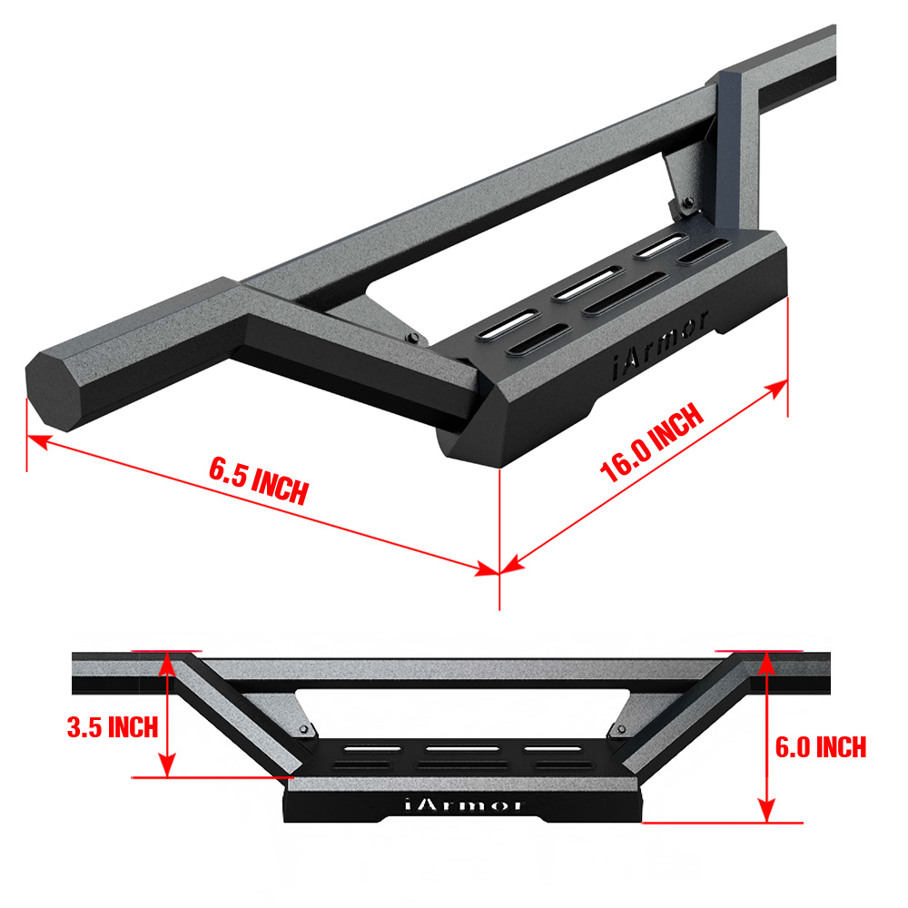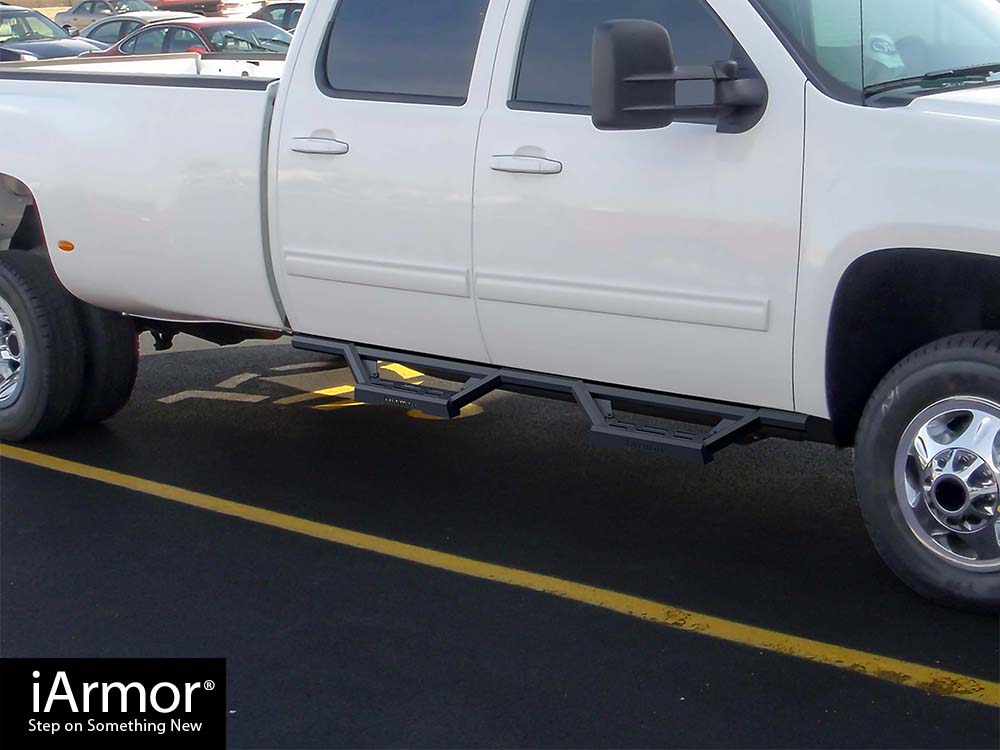 Tired of rusty steel side bars that suck up your wallet and gas mileage? The iArmor is your answer to a corrosion-proof, fuel efficient, and better looking set of side armor. With its stainless steel side bar, the iArmor will protect your rocker panels from impact and obstacles. Sick of tubular nerf bars and side bars that are Smittybilt knockoffs? The iArmor is your answer to unique looking step bars. With its patented tube design and slanted step plates, the iArmor will make your truck look badass and off-road ready. Serving both as side bars and side steps, the iArmor will provide a comfortable step up into your ride. Choose iArmor running board as your next truck mod upgrade - you won't regret it!