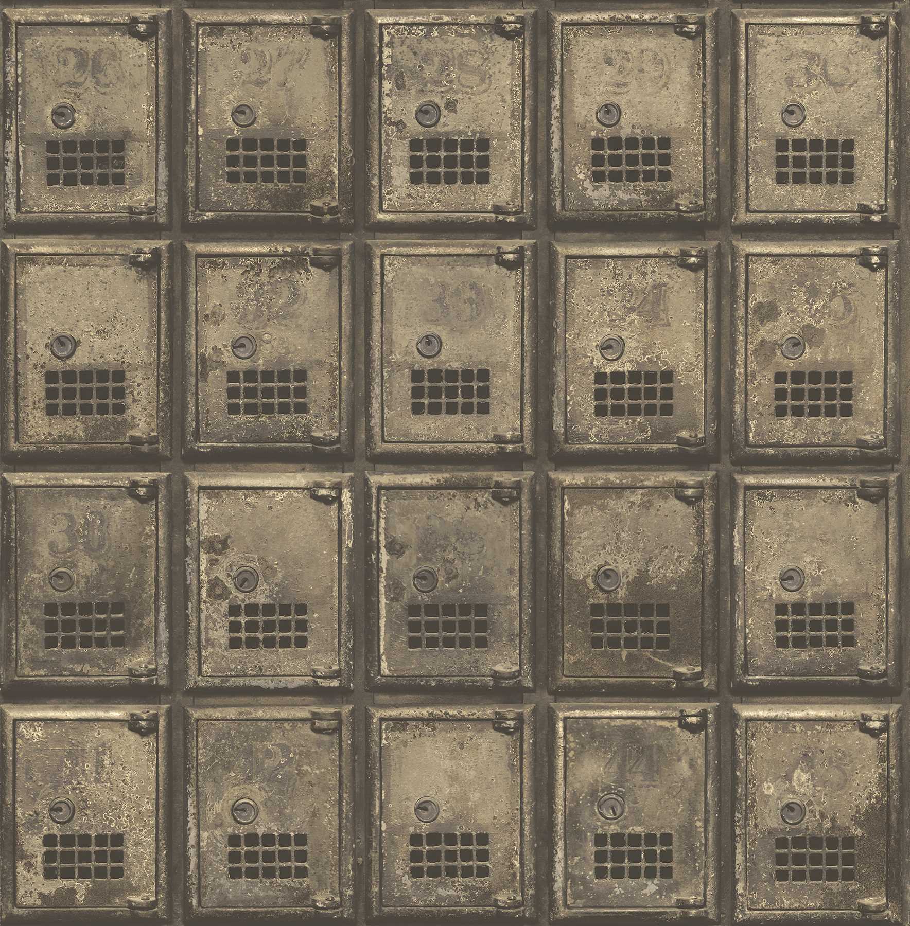 2701-22354 Vintage P.O. Boxes Distressed Metal with High Contrast Shading Wallpaper Brass Metallic Colors Modern Style Non Woven Unpasted Wall Covering Reclaimed Collection from A-Street Prints by Brewster Made in Great Britain