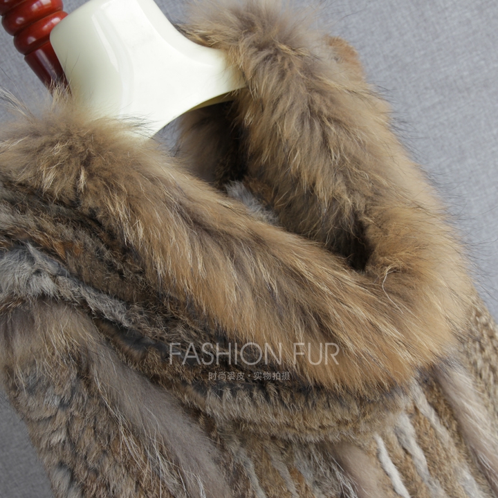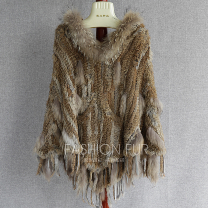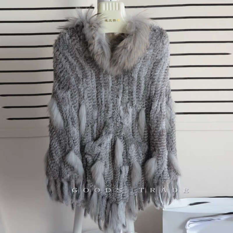 Womens Real Fur Hooded Knit Tassels Cape Outwear Cloak
