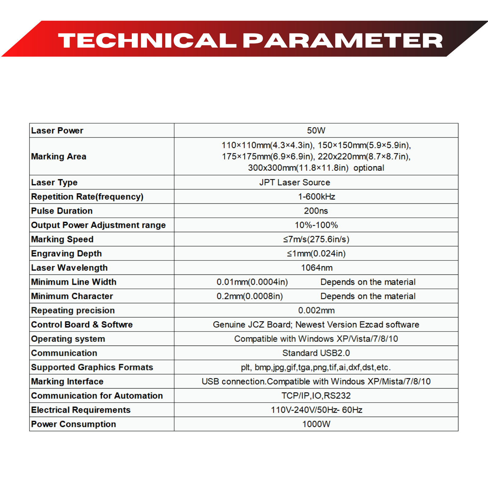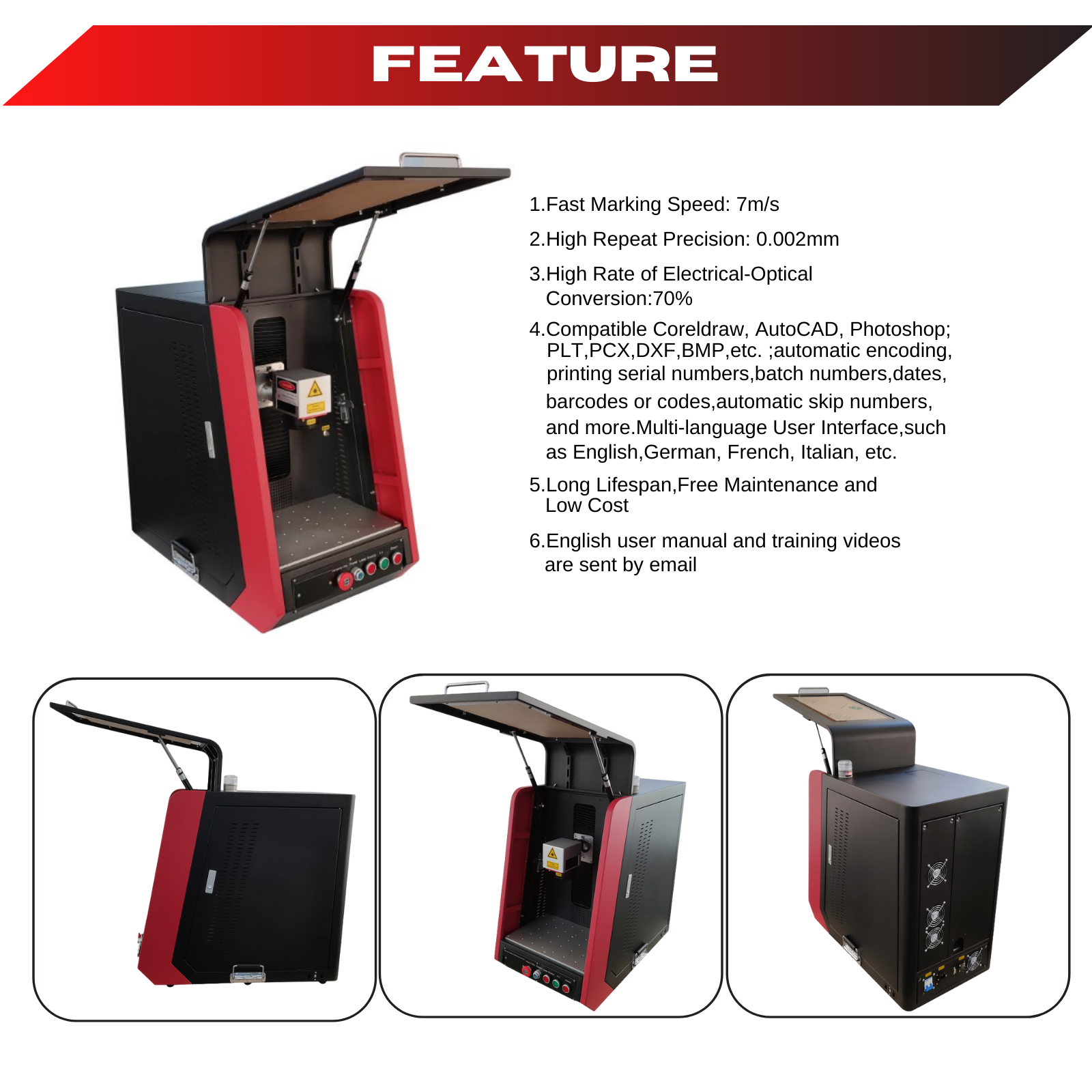 50W enclosed fiber marking machine: Default: 110V in US, 220V in Europe, Default: 150x150mm marking area; other area, please contact with us.