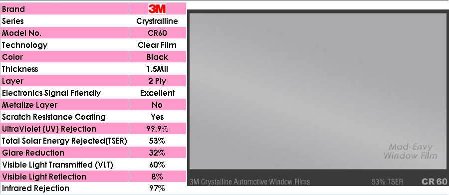 CR60 - Crystalline 60% VLT Automotive Window Tint Film Roll Quantity: 1 Piece Size: Choose the size you need