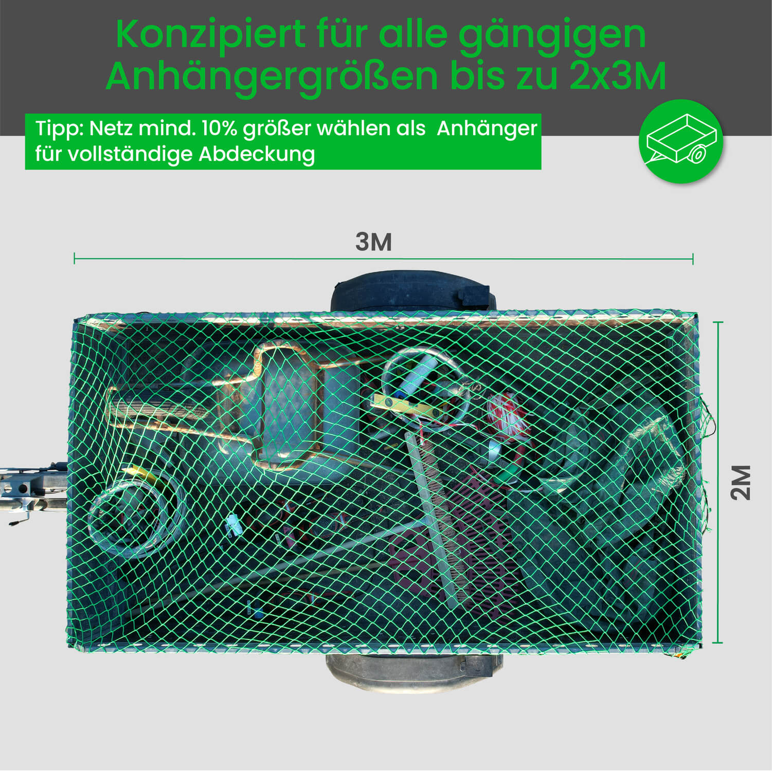 | Lieferumfang: | Anhängernetz, Gummiseil, Eckenmarkierung |