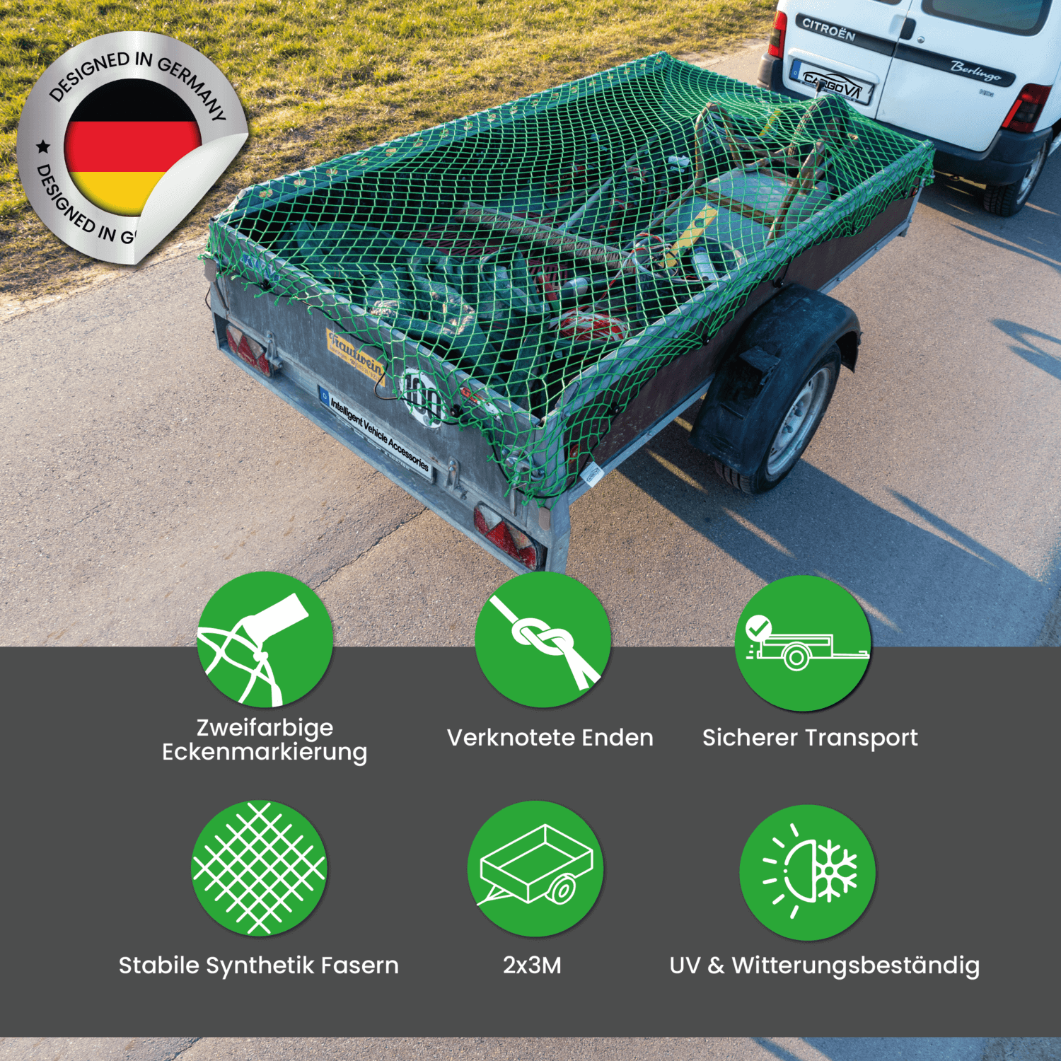 Als Gartenbauer benutzte ich selbstverständlich regelmäßig Anhängernetze. Mich hat allerdings schon immer gestört, dass man gerade bei größeren Netzen extrem schlecht die richtigen Ecken finden konnte und dementsprechend regelmäßig entweder die falsche Ecke in der Hand gehabt hat oder das ganze Netz einfach schepps auf dem Anhänger hängt.