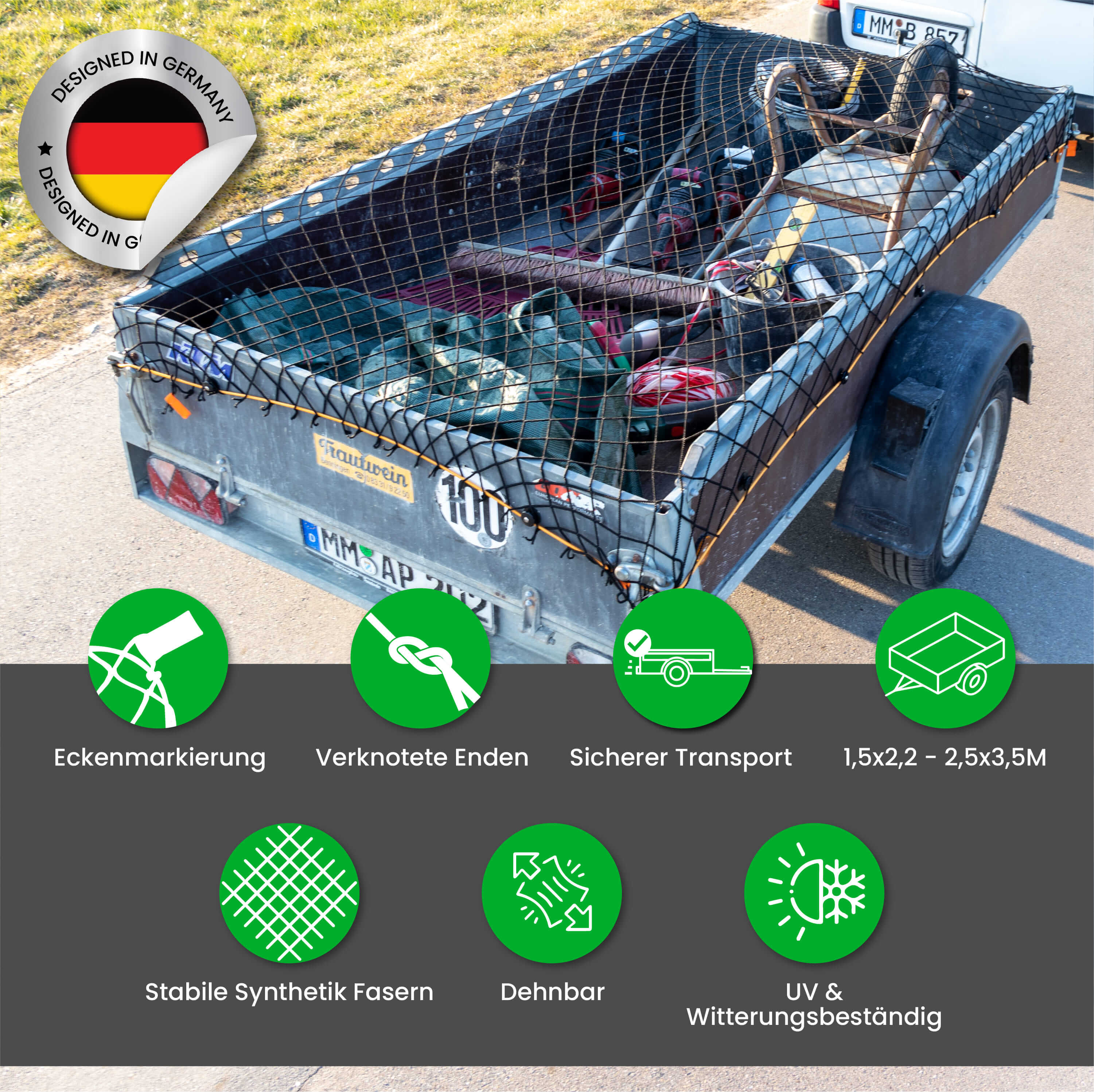 Deswegen dachte ich mir, ich fange einfach mal an die Ecken zu markieren und beginne auf Amazon die Anhängernetze in zunächst einer Größe zu verkaufen. Mittlerweile haben wir alle möglichen Größen im Sortiment. Und es stehen noch lauter Innovationen in der Ladungssicherung auf der to Do Liste.