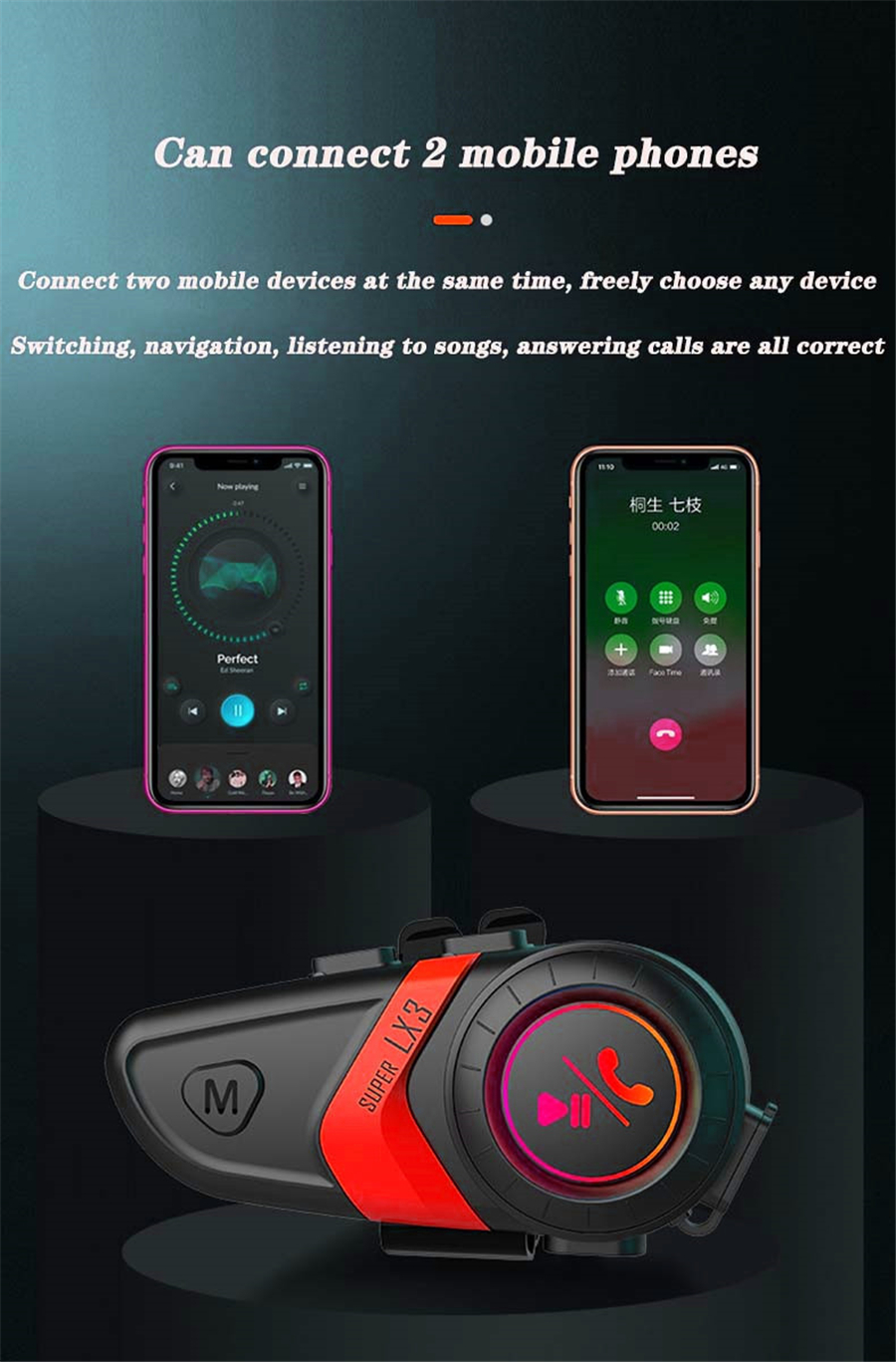 3. The product can be connected to two mobile phones at the same time to realize the control of the basic functions of the mobile phone, (answering calls, playing music); automatically answering calls, if you do not want to answer, you can press the button to reject or hang up, and then redial the last code.