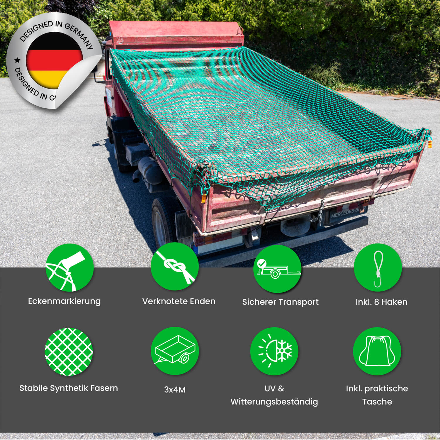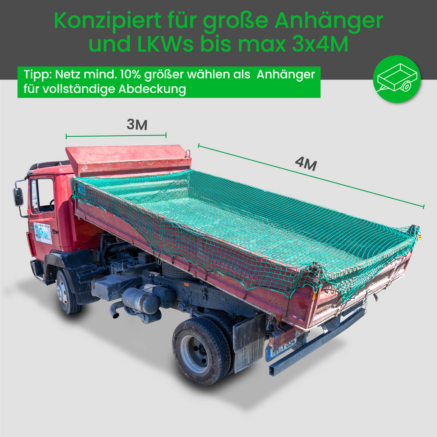 Anhängernetz 3x4M Abdecknetz Hängernetz mit Eckenmarkierung, Beutel, 8 Haken