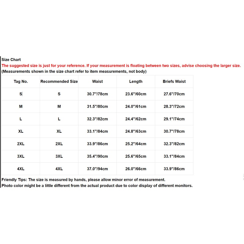 | Tag No. | Recommended Size | Waist | Length | Briefs Waist |
