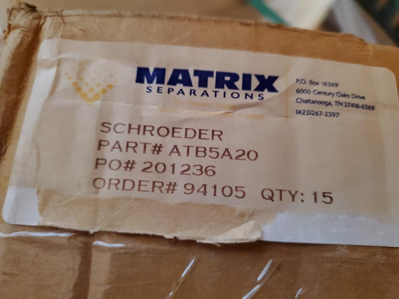 Here is a new lot of 15 Matrix Schroeder industrial polypropylene spun filters. These are 2.5" x 20. Model number is ATB5A20. Each purchase is for a box of 15 individually sealed filters. These are commercial / industrial grade and were new replacements for a reverse osmosis manufacturing line.