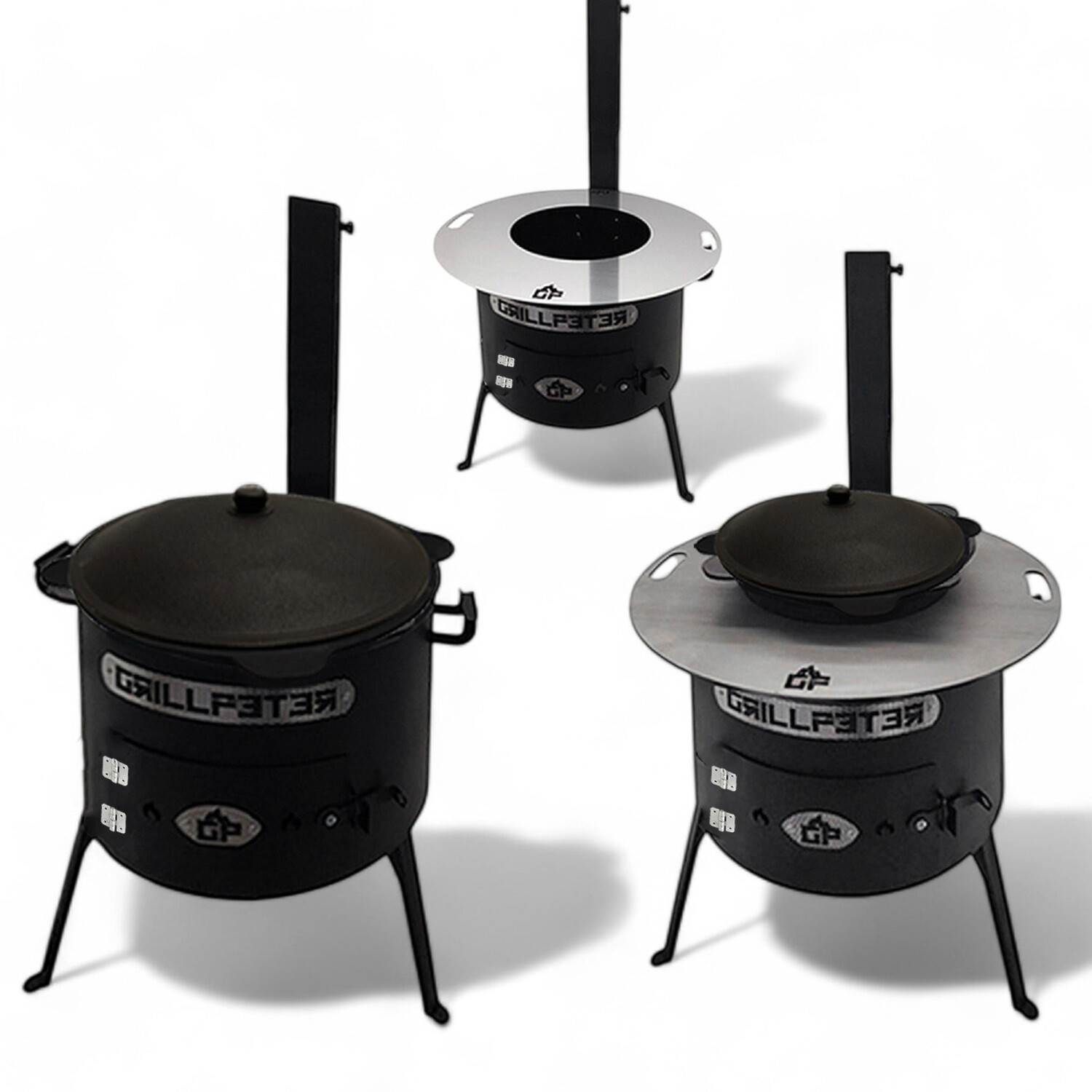 - Anwendung mit Feuerplatte, Rost, Pfannen möglich