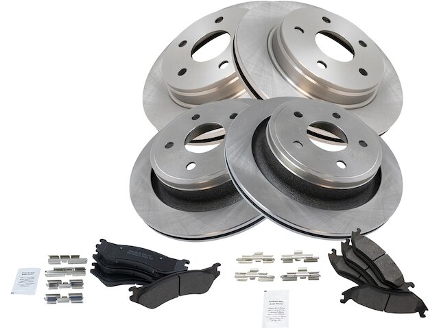 Package Contents: (2) Front Replacement Brake Rotors; (2) Rear Replacement Brake Rotors; (1) 12 oz DOT 3 & 4 Brake Fluid; (1) 13 oz Brake Cleaner; (1) Front Semi-Metallic Brake Pad Set with Contact Point Grease & Hardware; (1) Rear Semi-Metallic Brake Pad Set with Contact Point Grease & Hardware