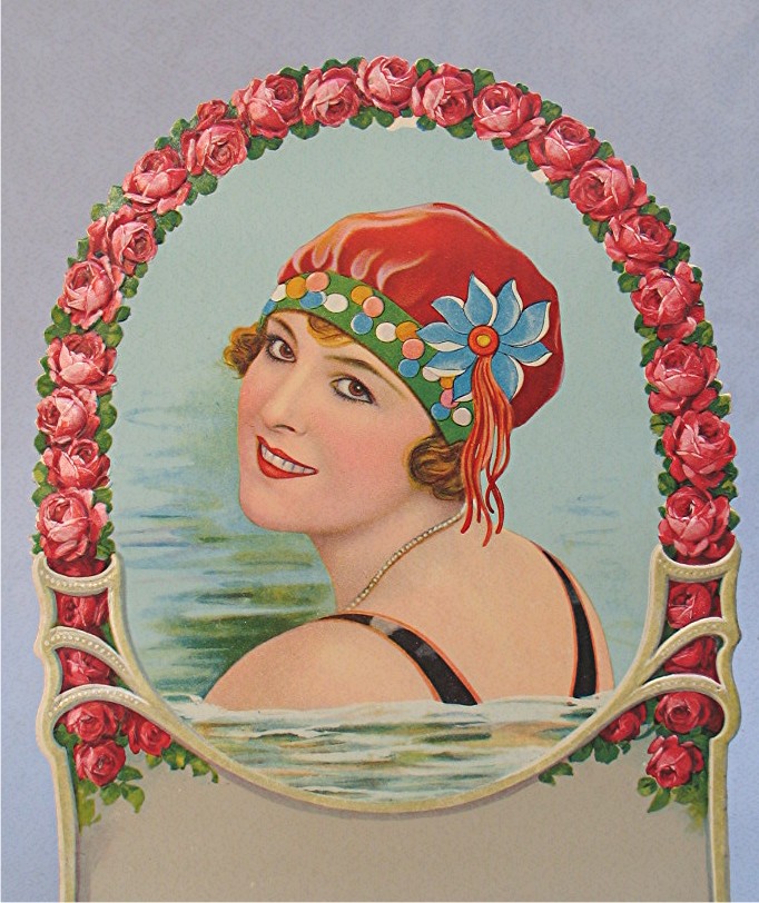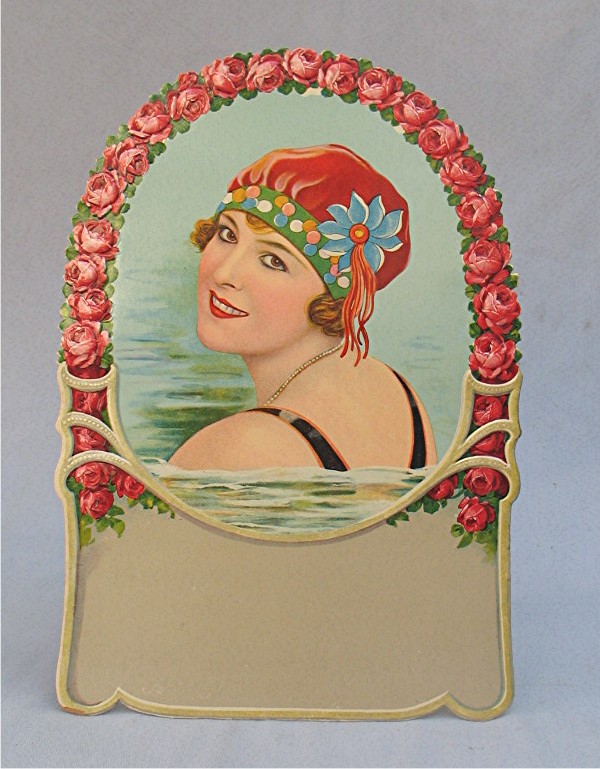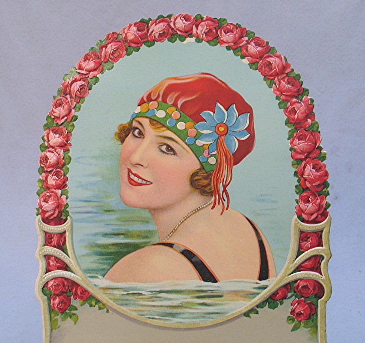 Vintage Die Cut Advertising Sign Unused... There is a blank section below the picture that would be used to print the name of a Store or Company to use as advertising; or calendar pages could be added... Piece has colorful, embossed illustration of a woman swimming wearing a nice swim cap, surrounded by a frame of embossed red roses... Piece is in excellent condition, and measures about 8" x 11 3/8"...