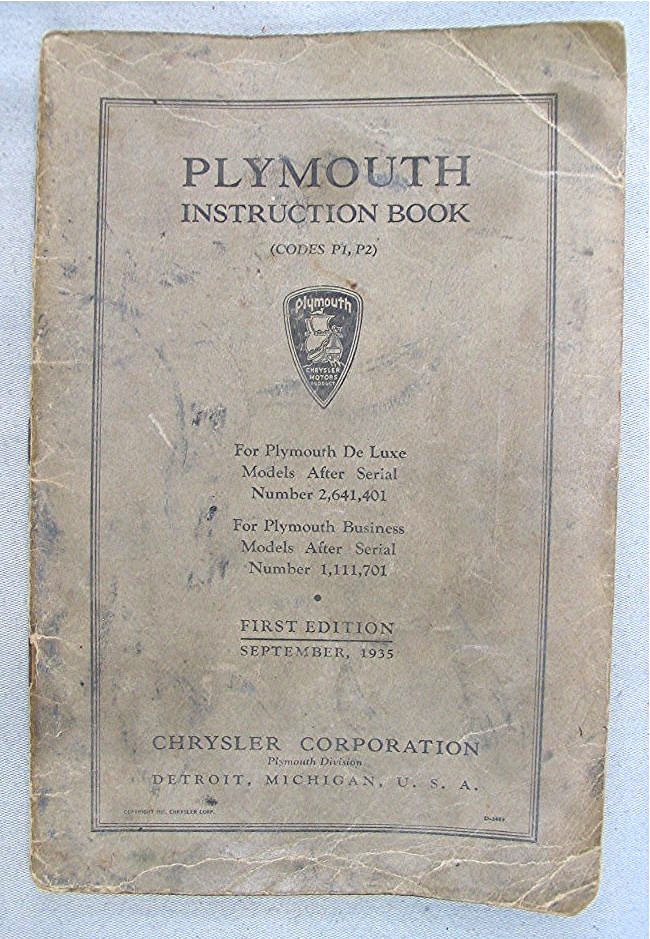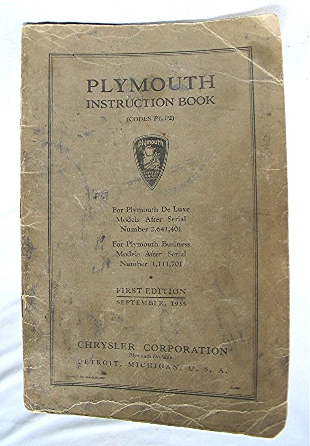 Vintage 1935 Plymouth Instruction Book... Cover reads, "Plymouth Instruction Book (Codes P1, P2) -- First Edition September 1935 -- Chrysler Corporation"... Instruction book is in good condition, cover has some staining... Book has about 44 pages of information, pictures and diagrams... Instruction book measures about 6" x 9"...