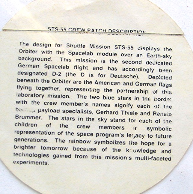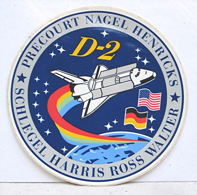 Vintage Sticker --- D-2 Precourt Nagel Henricks - Schlegel Harris Ross Walter... Colorful sticker has illustration of a shuttle in space with a rainbow from the jets, and both American and German flags... Back of the sticker has explanation of the STS-55 Crew patch... Sticker is in good condition, and measures about 3 3/4" across the diameter...