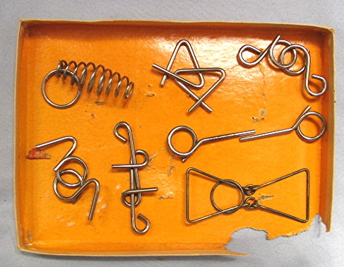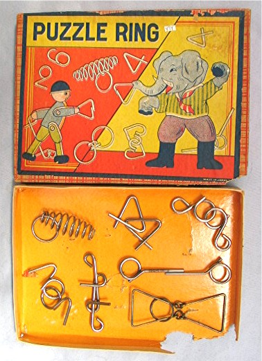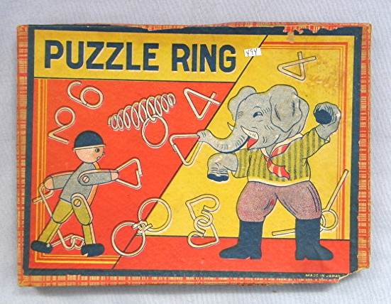 Vintage Boxed Set Japanese Ring Puzzles... Lid of box has decorative paper and a colorful label... Label has illustration of an Elephant dressed in a suit and a man surrounded by wire puzzles, label reads, "Puzzle Ring --- Made in Japan"... Inside lid of the box has illustrated instructions... Set comes with 6 wire puzzles... Box has some damage to both the top and the bottom... Box measures about 6 3/4" x 5" x 1/2"...