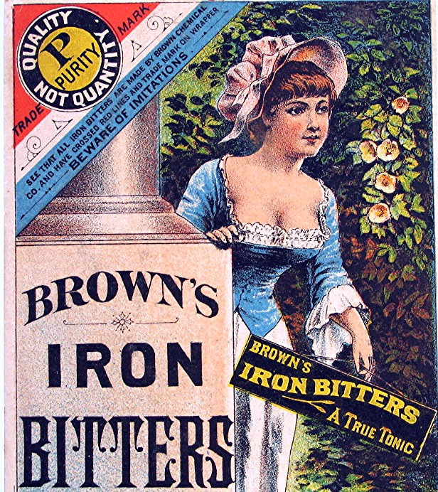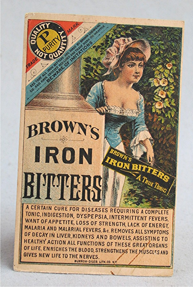 Vintage Browns Iron Bitters Victorian Trade Card... Card has colorful illustration of a woman and flowers... Card advertising, "Brown's Iron Butters - A Certain Cure for Diseases"... Card is in good condition some wear from age, and measures about 2 3/4" x 4 1/2"...