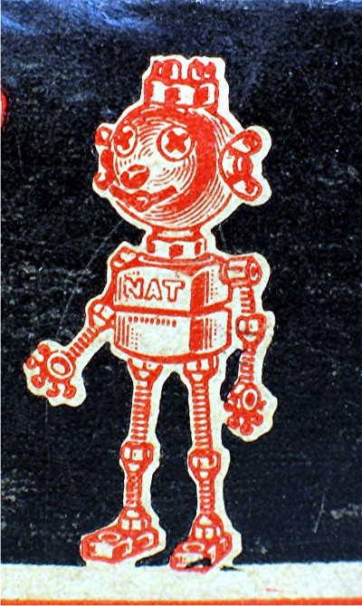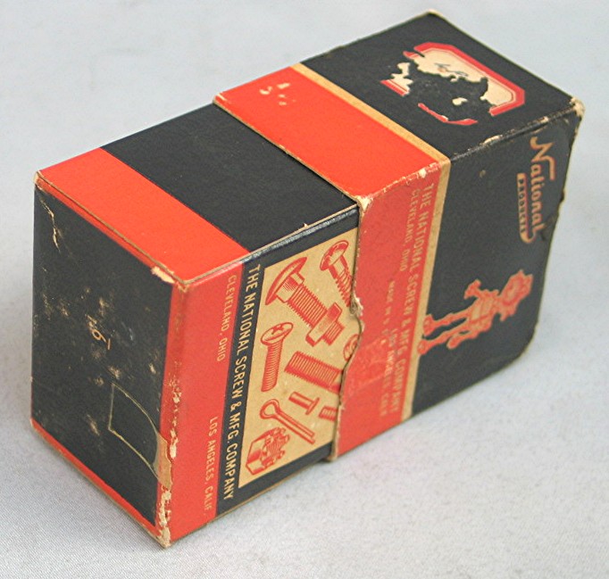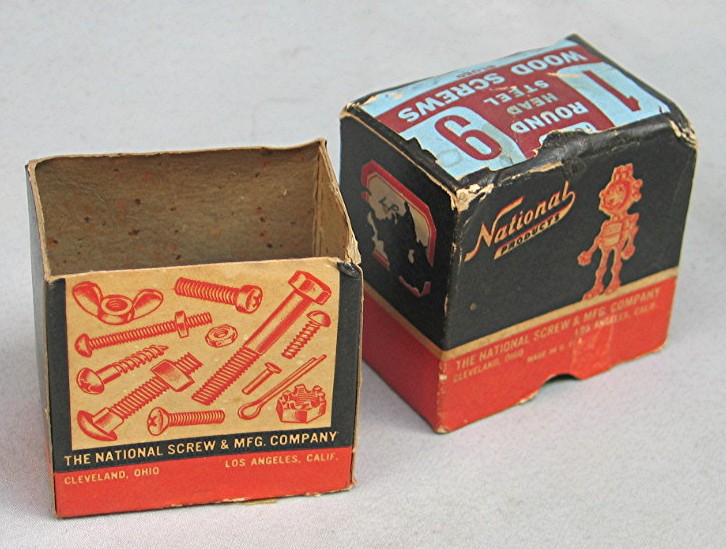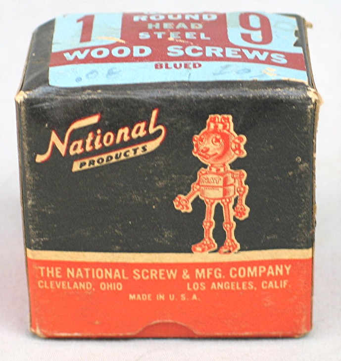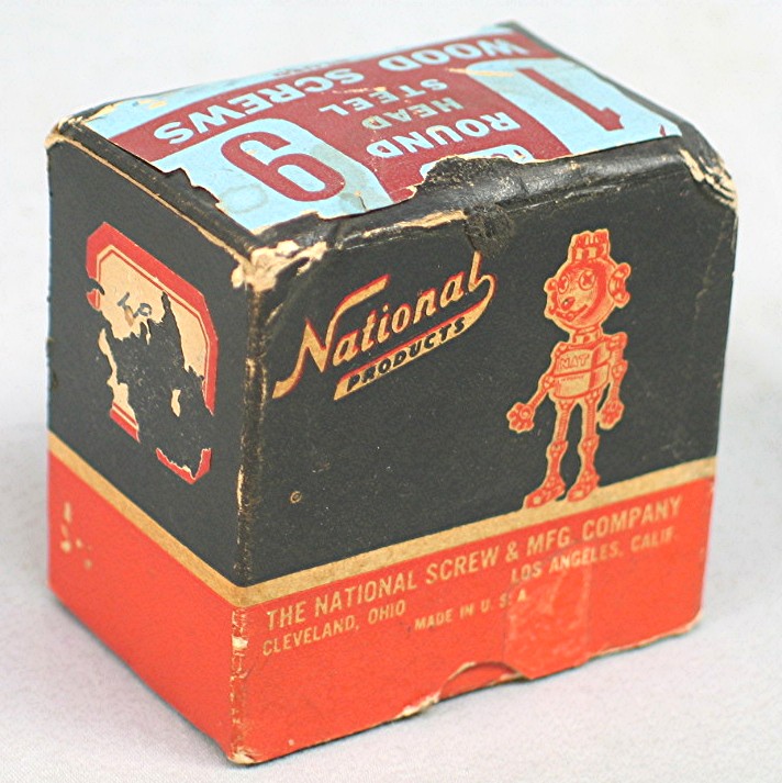 Vintage National Products Wood Screw Box... Small black and red paper box with illustration of Robot logo... End of box has label that reads, "1 - 9 Round Head Steel Wood Screws"... Box is in good condition, and measures about 2 1/2" x 1 3/4" x 2 1/2"...