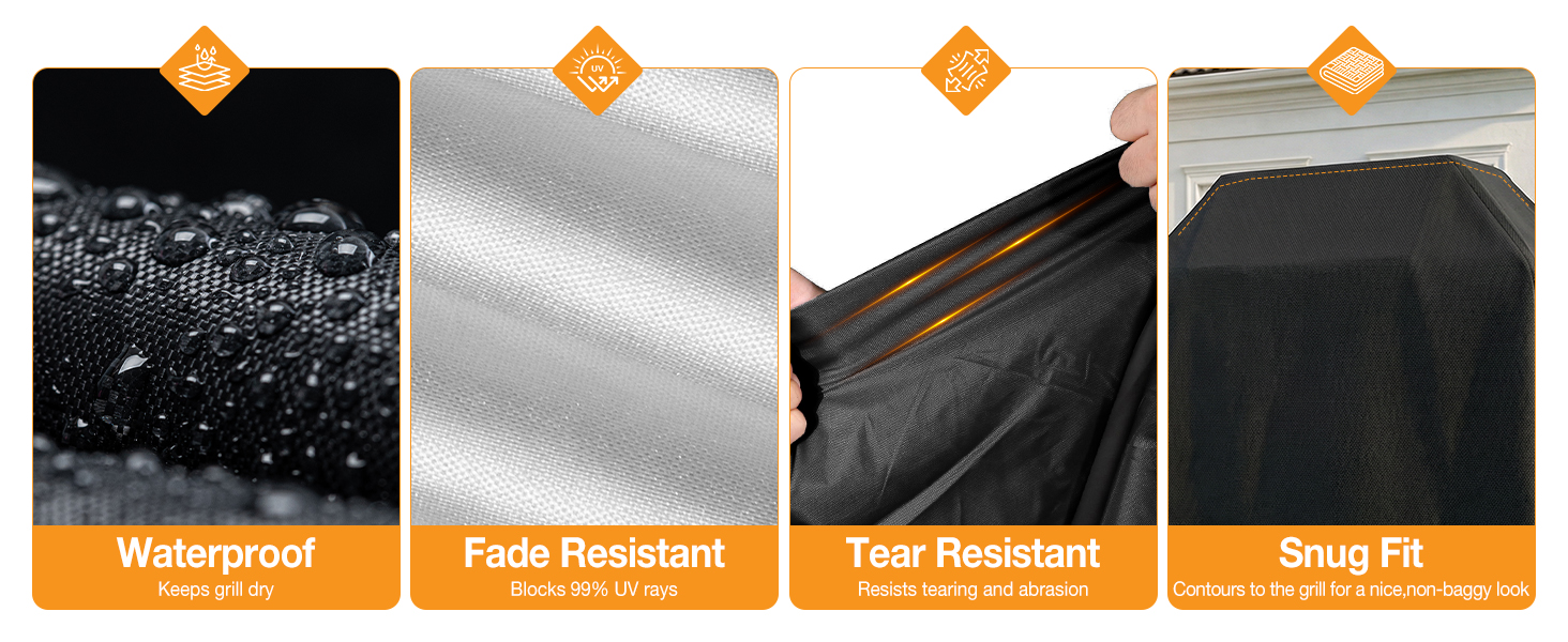 【ALL-WEATHER DURABILITY】Crafted with 210D/420D oxford fabric and PVC coating this heavy duty BBQ grill cover is rip resistant, waterproof, sun-safe and weatherproof.