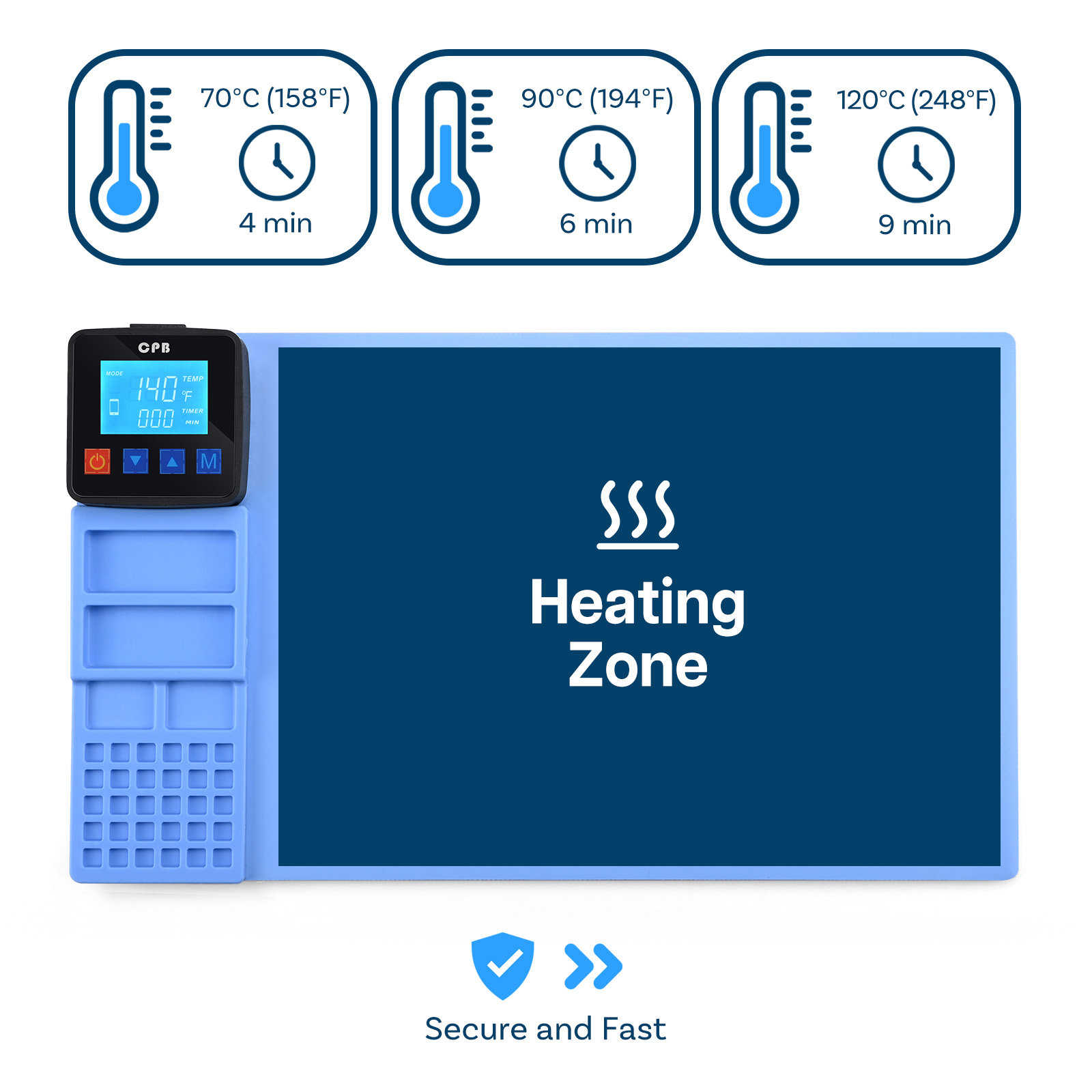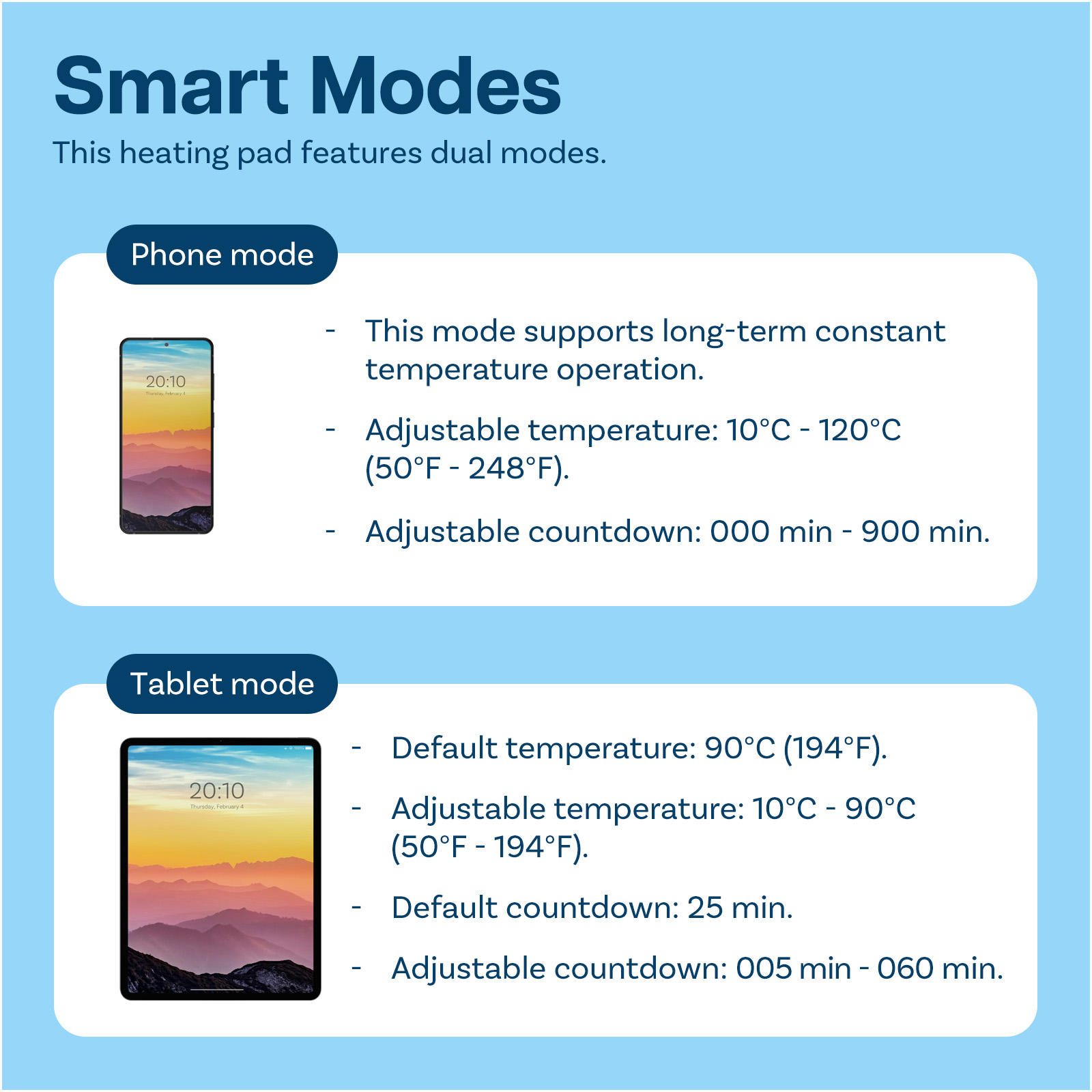 - Smart Modes: This Heating Pad has 2 unique modes; Mobile phone mode and Tablet mode to provide a more Suitable Temperature. Phone mode sets the temperature to 50℉‑248℉ (10℃‑120℃), Tablet mode sets the temperature 50℉‑194℉ (10℃‑90℃).