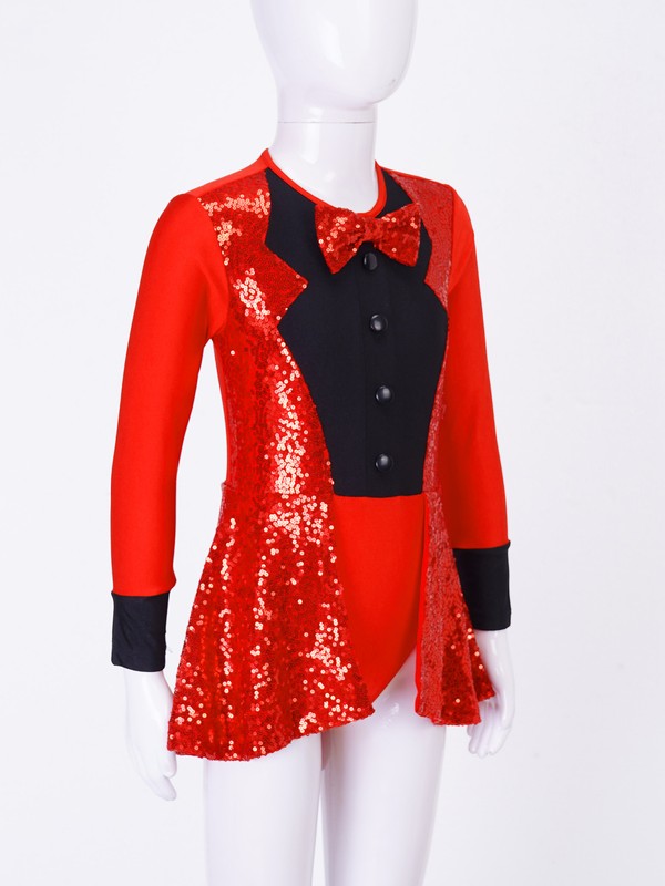 Long sleeves, bow tie and sequins adorned, jazz dance leotard with hem.