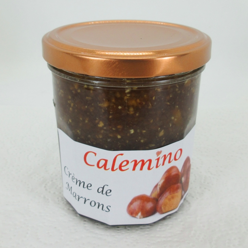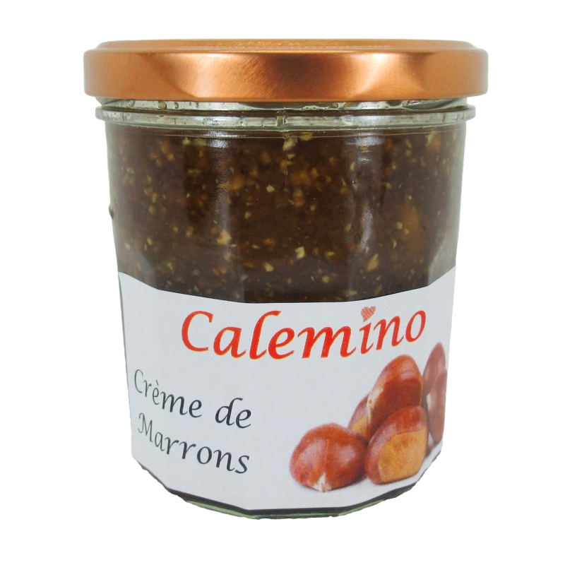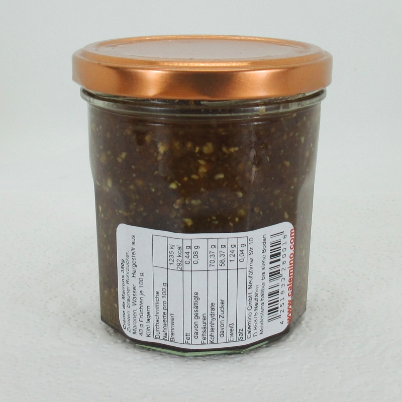 Crème de Marrons ist eine französische Spezialität aus Eßkastanien - auch Maronen genannt. Es handelt sich durch die Zugabe von Zucker um eine Art Marmelade, die wir in liebevoller Handarbeit erstellen und dabei keine unnötigen und überflüssigen Stoffe hinzufügen. Nur reife Maronen, Zucker und Wasser, mehr braucht die Original Crème de Marrons nicht. So erhalten Sie ein reines Naturprodukt von höchster Qualität. Anstatt herkömmlichen weißen Zucker verwenden wir ausschließlich braunen Rohrzucker, so bekommt die Crème de Marrons nicht nur optisch eine wesentlich dunklere und ansprechendere Farbe, sondern auch einen unvergleichlichen Geschmack mit einer leichten Karamellnote. Kastanienmus ist sehr populär in Italien und Frankreich, vor allem als klassische Beilage zu Fleischgerichten, besonders zu Wild wird es gerne als Beilage gereicht, so wie in Deutschland Wildpreiselbeeren. Oder Sie verwenden es als Füllung zu Geflügel wie Ente, Gans oder Pute oder als Panade für Geflügel-Schnitzel. Aber am beliebtesten ist Crème de Marrons zu Süßspeisen: Entweder pur gegessen, als Brotaufstrich, mit Quark, Yoghurt oder Frischkäse vermischt oder dünn auf Pfannkuchen und Crêpes. Verfeinern Sie doch mal Kuchen, Torten, Gebäck, Pudding oder Eisdesserts mit unserer Crème de Marrons. Am bekanntesten ist jedoch das Dessert Mont Blanc mit Crème de Marrons: Die Crème de Marrons wird pur oder mit Schlagsahne untergehoben kegelförmig auf dem Teller geformt und als Spitze Crème Fraîche aufgesetzt, so daß das Dessert optisch an den gleichnamigen Berg erinnert. In unserem großen 350g Konfitürenglas mit Riffelung, wodurch das Glas besonders gut in der Hand liegt. Nicht nur für sich selbst eine kulinarische Köstlichkeit, sondern auch bei Einladungen eine attraktive Aufmerksamkeit. Zutaten: brauner Rohrzucker, Maronen, Wasser Hergestellt aus 40 g Früchten je 100 g. Kühl lagern