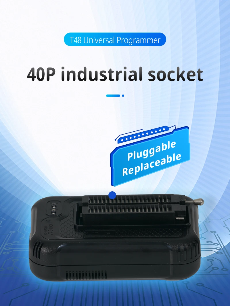With 40-pin industrial high-quality ZIF Socket (Pluggable/replaceable), newest model T48 (TL866-3G) programmer is the improvement of TL866II Plus programmer. Based on 32-bit MCU with 120MHZ and 4-layer PCB design, this professional T48 programmer support high-capacity NAND EMMC up to256GBand programming speed is much higher. Suppport high-voltage chips, VPP Maximum up to25V, that is what TL866II cannot achieve. Production of high-density SMD technology, a unified user interface, easy to use, fully functional, reliable program running of application software, ultra-small (size is almost the same as TL866II), code-runs much faster, support multilanguage menu (English, Chinese, Russian, Polish, German, Spanish, Portuguese, Turkish, Czech, Italian), it can automatically identify the operating system to install and run under Windows XP,2003,2008,Vista Win7 WIN8 WIN10 WIN11. Overall, T48 offers significantly improved performance and excellent value for money.