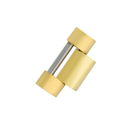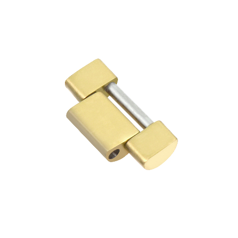 This link has a shiny center and matte finish on the sides. It is made of 316L stainless steel with gold color plating and includes one screw. No logo or markings on the link. Not compatible with newer 6-digit models.