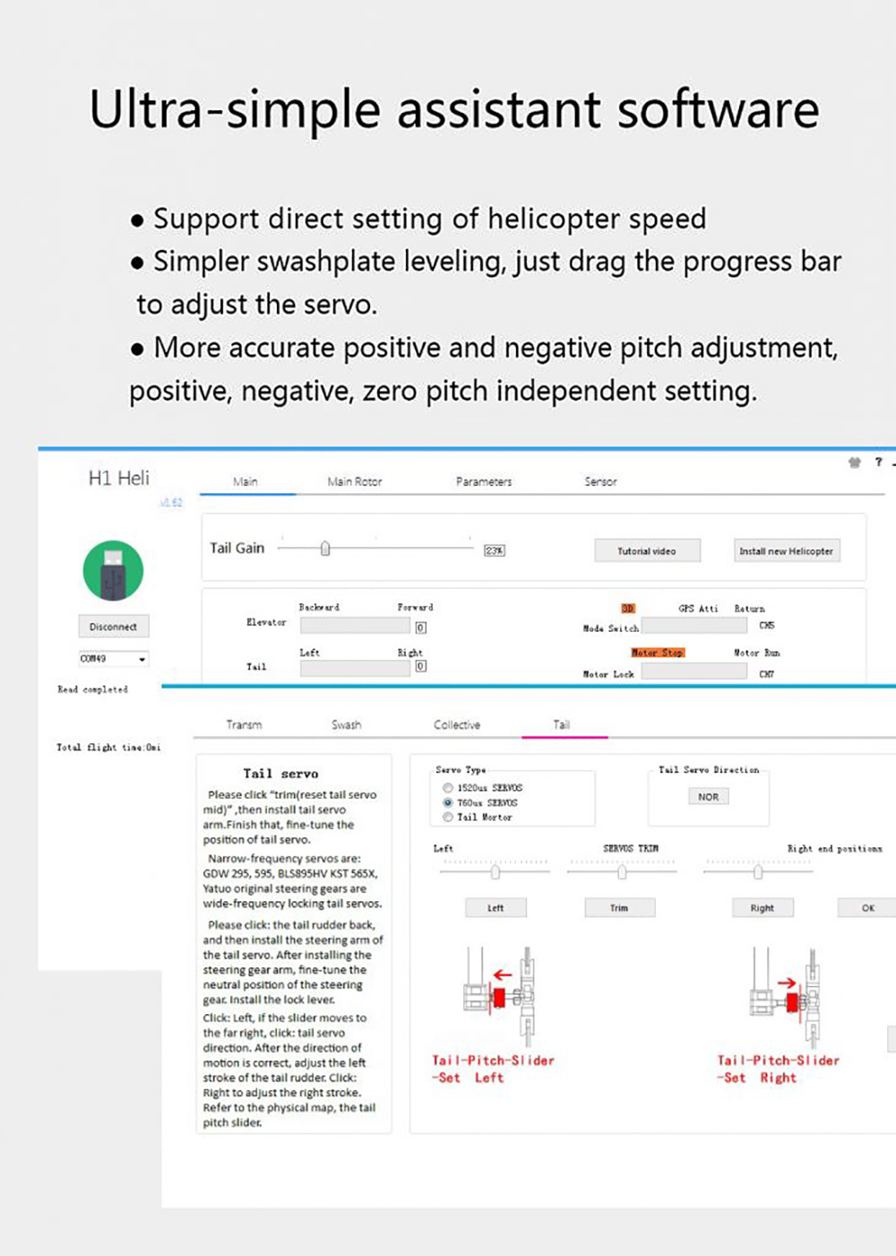 2.Flight Control System Software: Ultra-simple assistant software.Support direct setting of helicopter speed.Simpler swashplate leveling , just drag the progress bar to adjust the servo.More accurate positive and negative pitch adjustment ,positive , negative , zero pitch independent setting