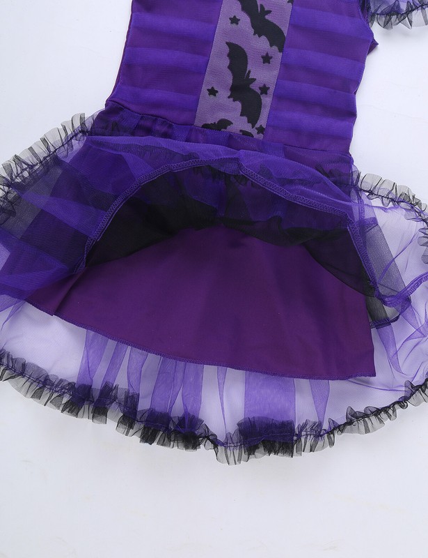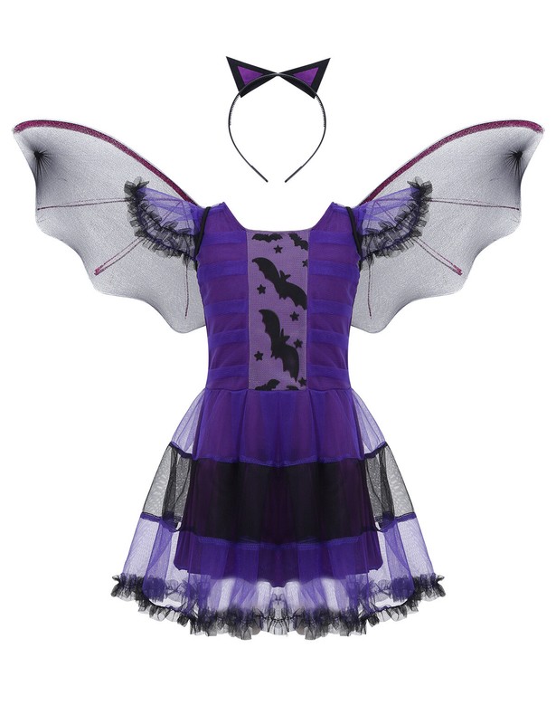 2 layers skirt, top mesh in purple and black, 1 lining. Headband with ears design and wired bat wings with shiny detailings, matching well with cosplay dress.