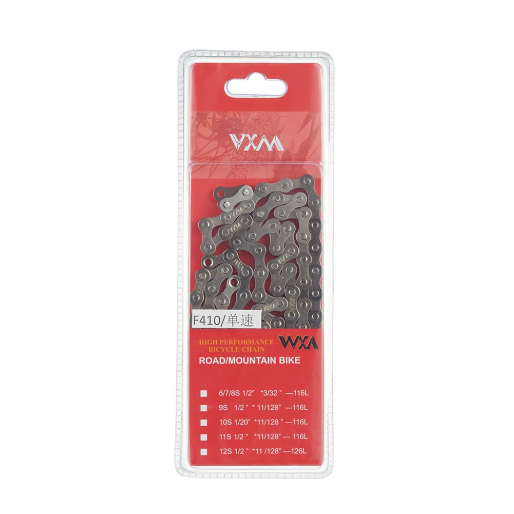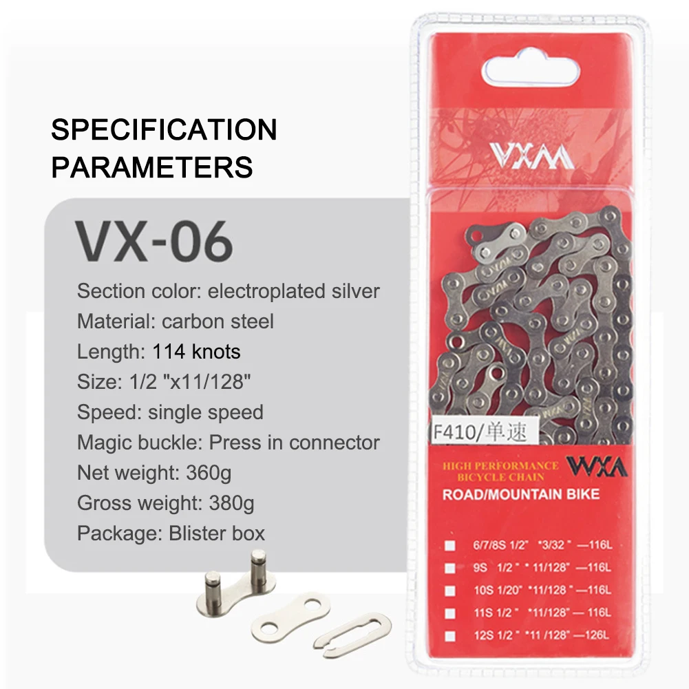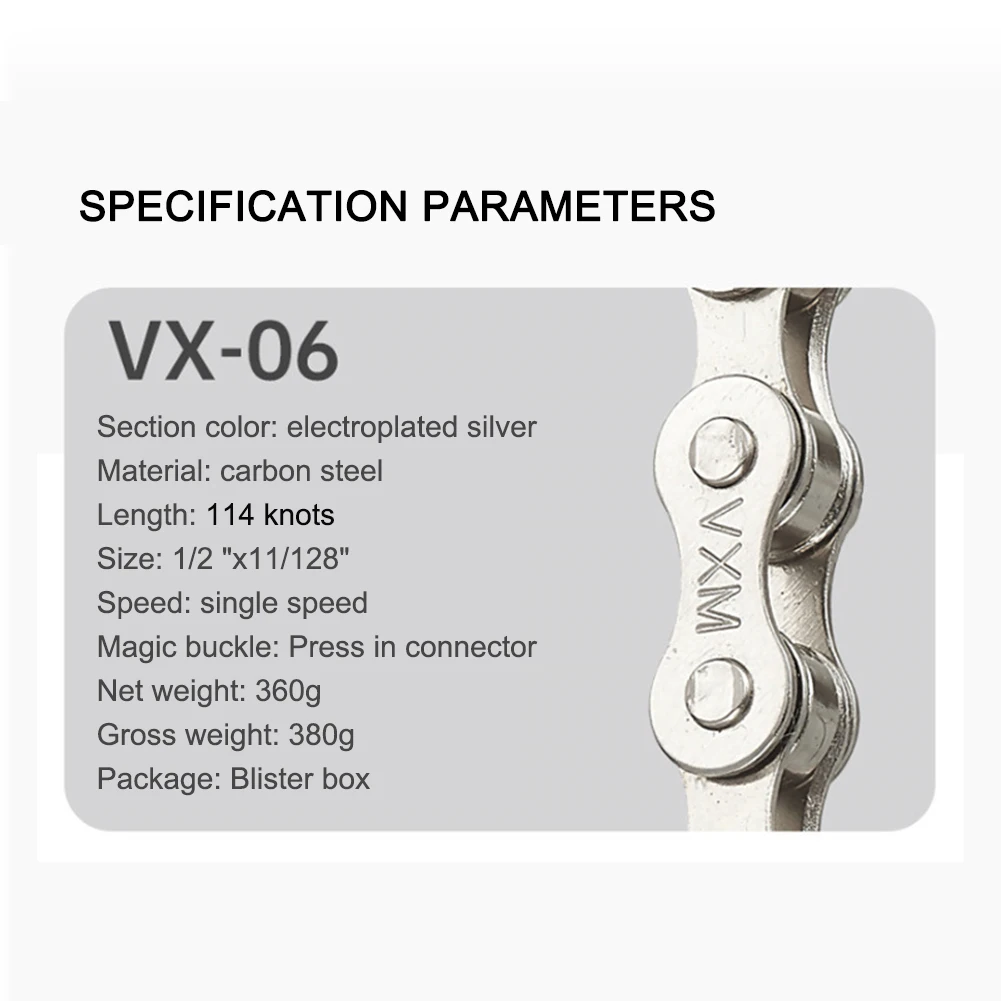 Feature: Double chain piece design, sensitive and smooth, intense transmission state, smoother and more stable operation between teeth. Built-in shaft, high fitting force, strong pulling force, faster response rate, higher transmission rate, and lower power transmission loss. New structure - one-piece stamping, high-rigidity forging process, can withstand high-intensity instantaneous explosive force, greatly enhance the service life. Specification: Name: Bicycle single speed chain Color: Electroplated silver Material: carbon steel Length: 114 knots Size: 1/2"X11/128" Speed: single speed Chain link: Press-fit connector Net weight: about 360g Packing size: about 240*90mm Note: Due to the different monitor and light effect, the actual color of the item might be slightly different from the color showed on the pictures. Thank you! Please allow 1-2cm measuring deviation due to manual measurement.