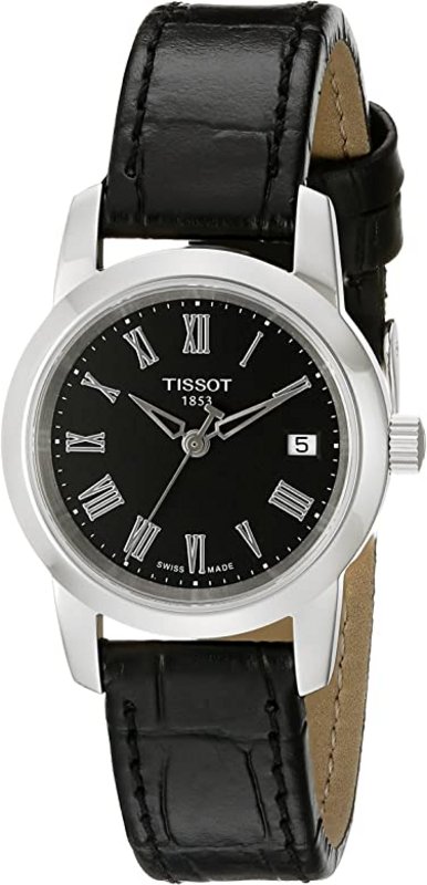 Watch Information: Gender: Ladies Case Size: 27mm Dial Color: Black Material Case: Stainless steel Material Band: Leather Diamonds: n/a Movement: Analog Quartz Water Resist: 100 Meters Water Resistant Features: Date Additional Info: Packaging: Original Box and Paper Retail Price: