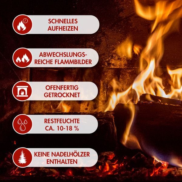 Holzfeuchte: max. 25 % (Scheite, gespalten, innen gemessen)